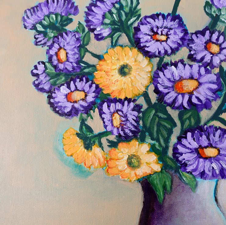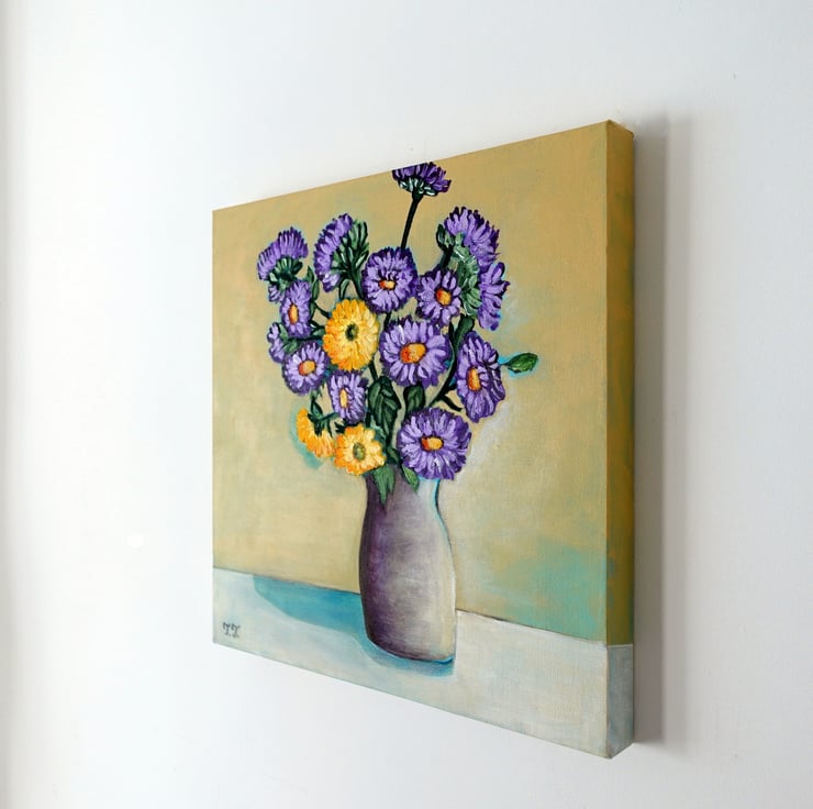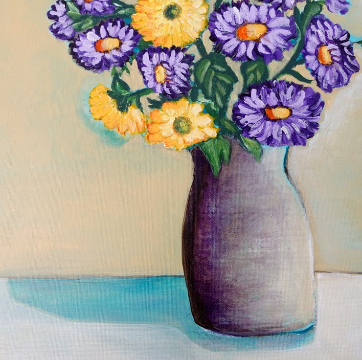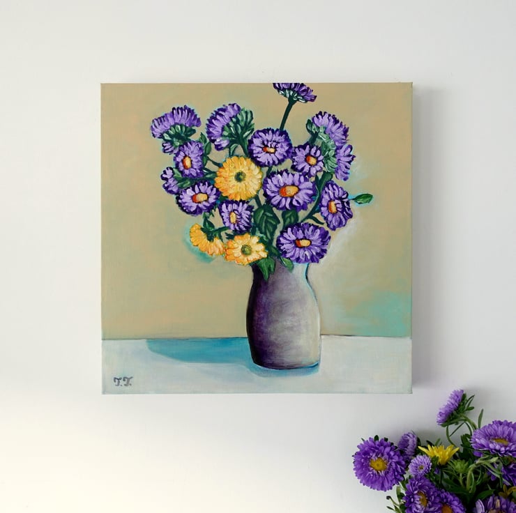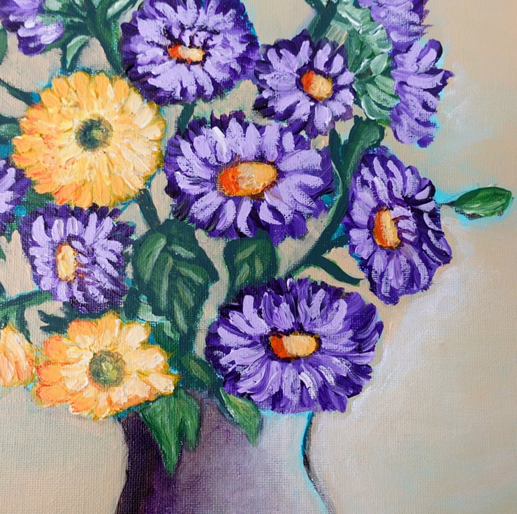 This still-life painting is created in acrylic on box canvas, and it depicts a bouquet of purple chrysanthemum flowers and three more yellow flowers in a brown-purple vase against a yellow-cream background. The artwork is painted on the edges, varnished for protection and ready to hang, and it measures 15.5" x 15.5" x 1.5". Chrysanthemum flower symbolises optimism and joy; this painting will bring a smile to your face and a spot of colour into your home.