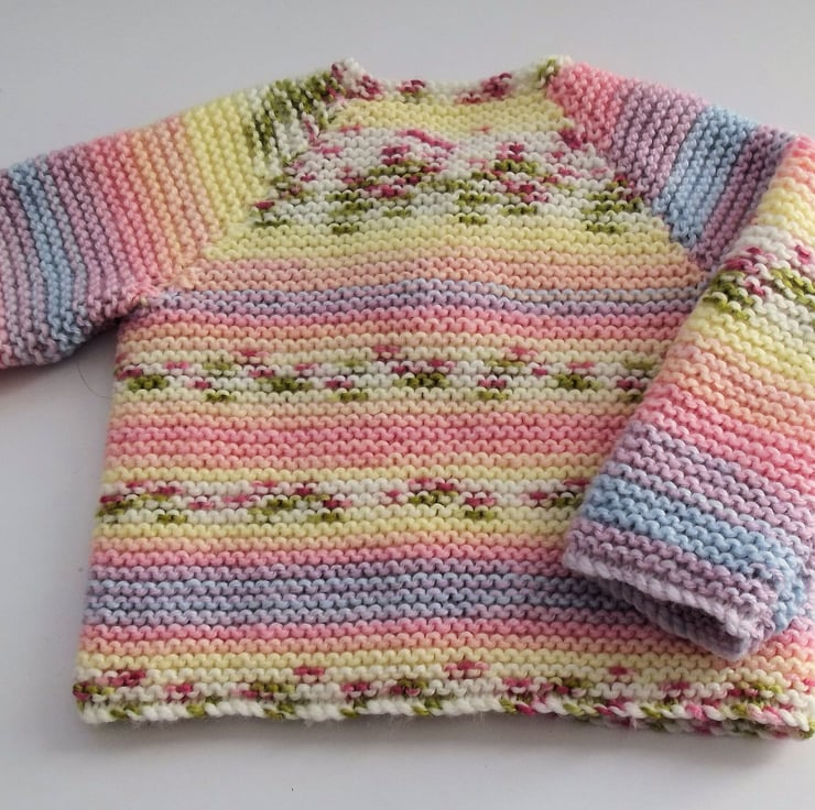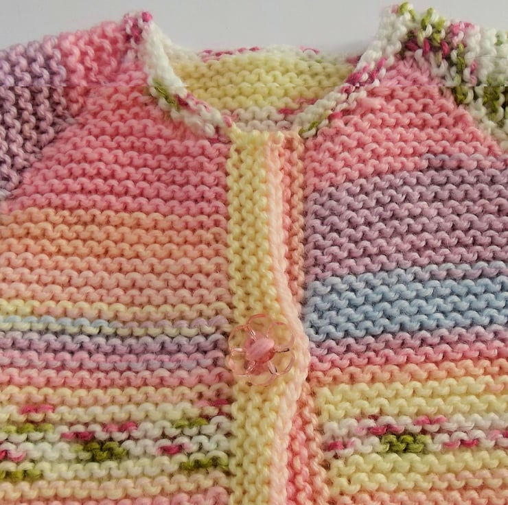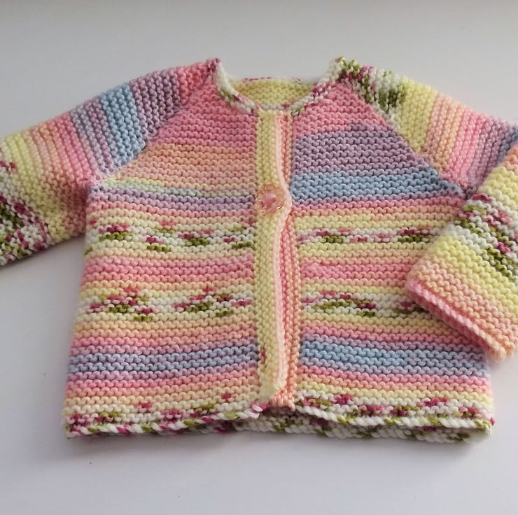 Hand knitted by me. Multi Coloured Cardigan Jacket. Round neck with 1 clear flower button closure. Knitted in medium weight acrylic blend yarn. hm157