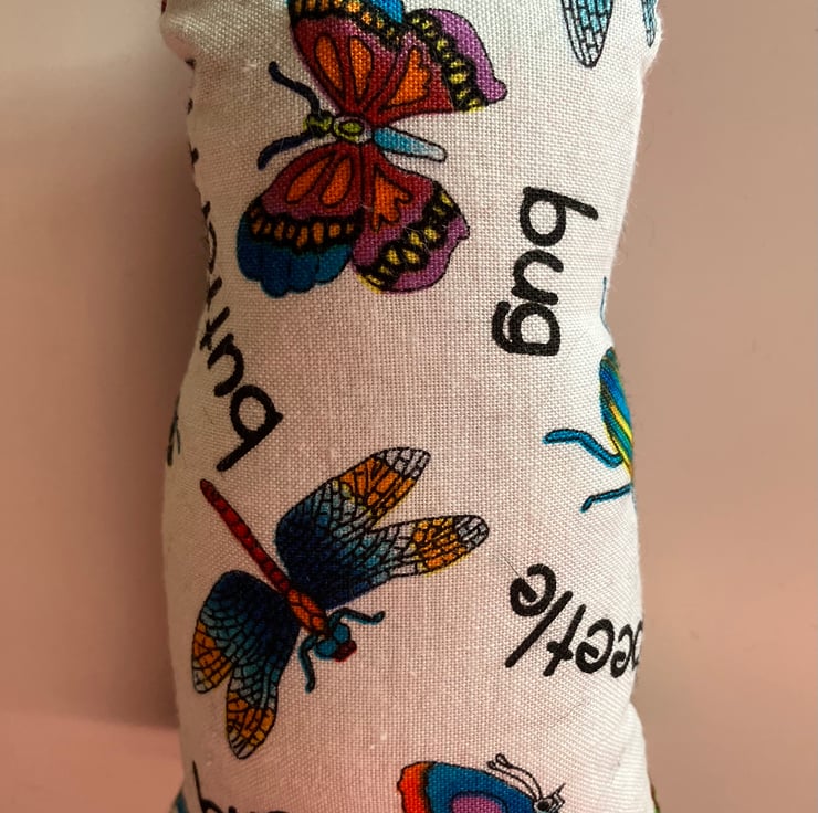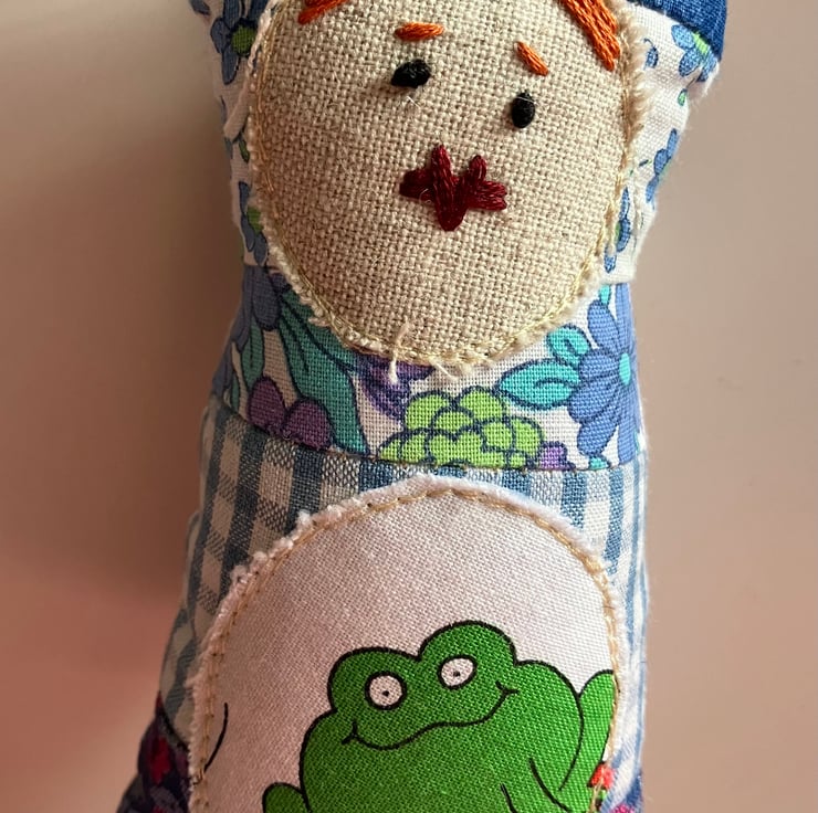 Hand embroidered face and a frog tummy, the back has minibeast fabric. Hang anywhere around your home from the twine loop. Approximately 20cm tall and 8cm wide. Stuffed with toy filling.