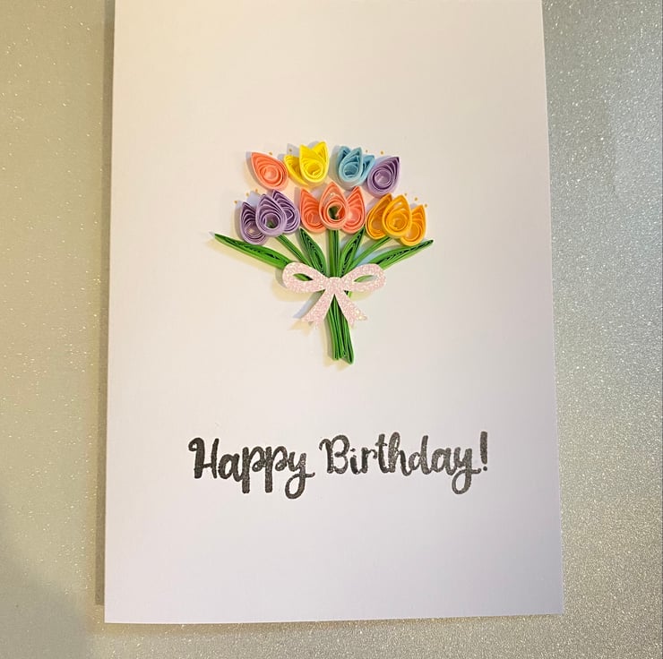 A beautiful handmade card with a bouquet of pastel quilled tulips
