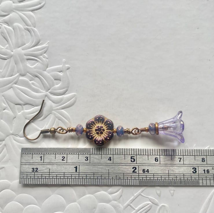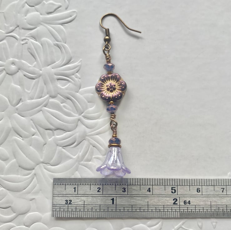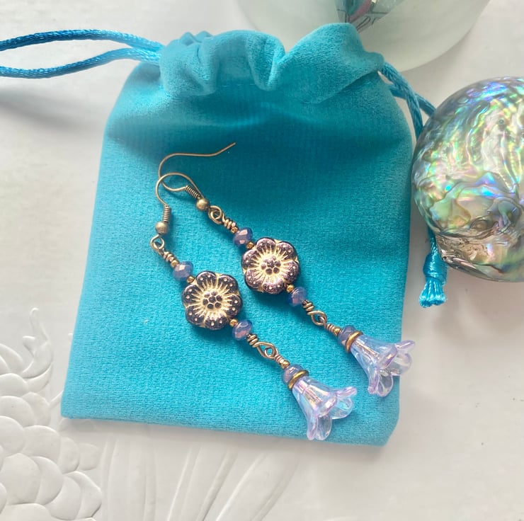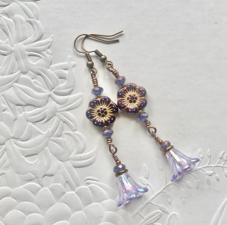 I made these beautiful long drop earrings using 12mm Czech glass flower beads and faceted rondelles. I have added lovely iridescent Lucite flower dangles to the bottom and linked everything together with hand wrapped antique bronze links. I have finished the earrings with antique bronze shepherd hooks. Beautiful earrings with lots of movement.