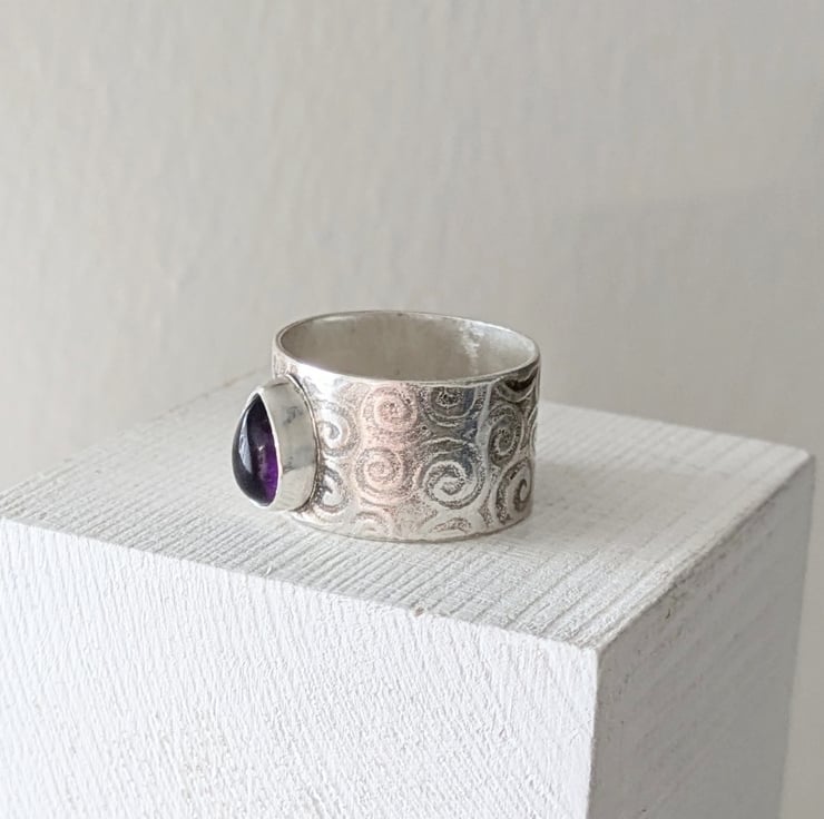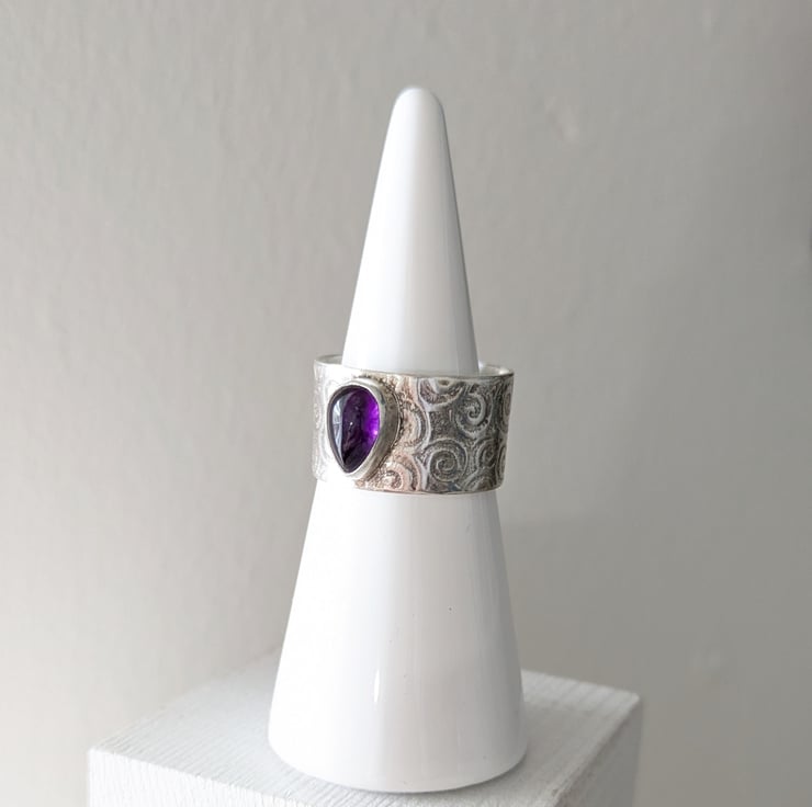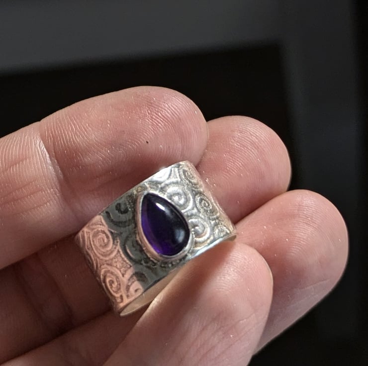 Teardrop amethyst stone is set in sterling silver on a wide ring band that I've impressed with a scroll pattern. This is oxidised to darken the silver before being polished so the pattern stands out.