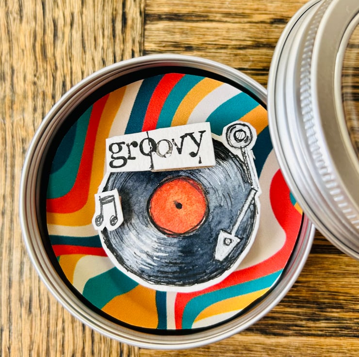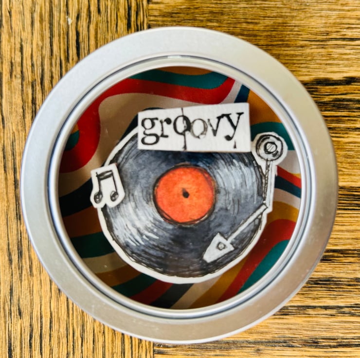 A quirky hand drawn and painted original 3D illustration, featuring a vinyl record on a turntable and hand-stamped words saying ‘Groovy’. Carefully cut out and mounted in an attractive tin with a clear window, on retro patterned background paper.