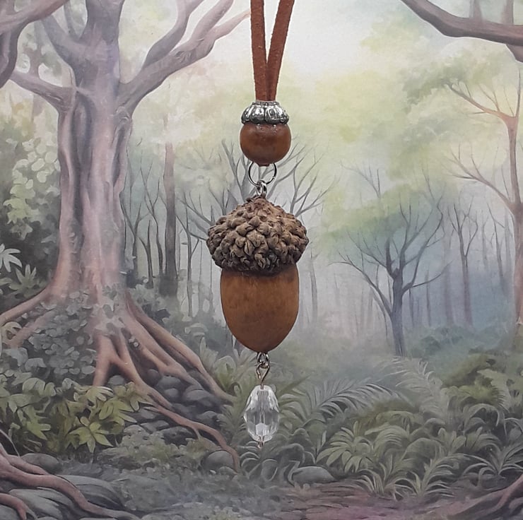 Acorn necklace a very nice acorn necklace, the acorn cap is real ,the acorn is hand carved from Hazel, featuring a teardrop glass bead hanging from the base, the top bead is made of wood with aged decor for that worn look, the cord is a suede material and is long enough to tie to the length you require.