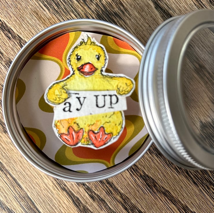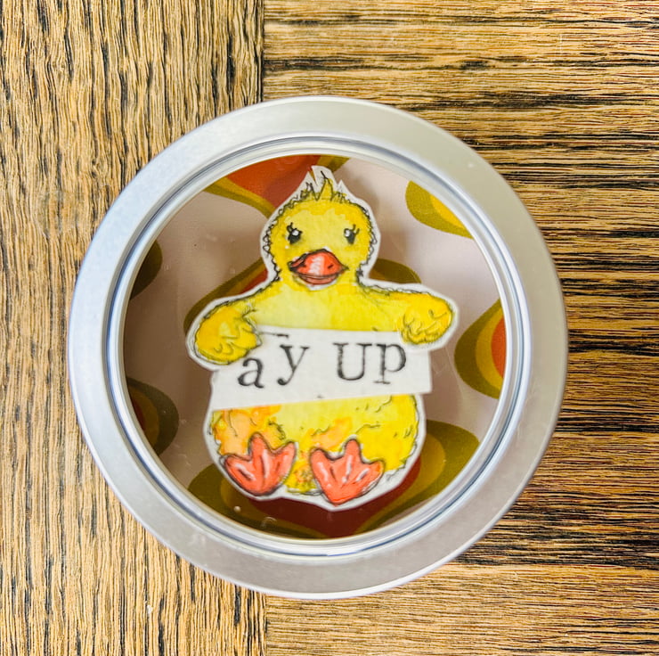 A quirky hand drawn and painted original 3D illustration, featuring a duckling holding a sign with hand-stamped words saying ‘Ay Up’. Carefully cut out and mounted in an attractive tin with a clear window, on retro patterned background paper.