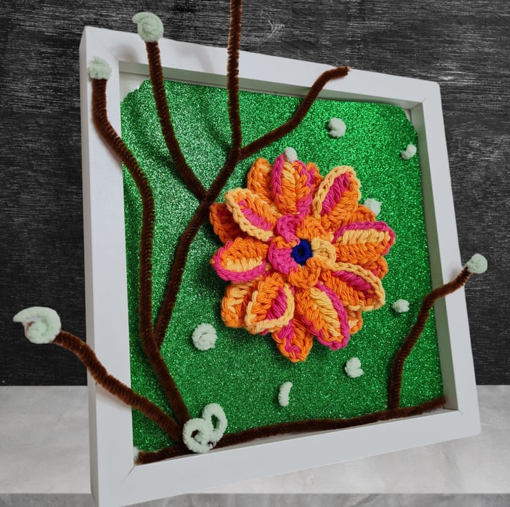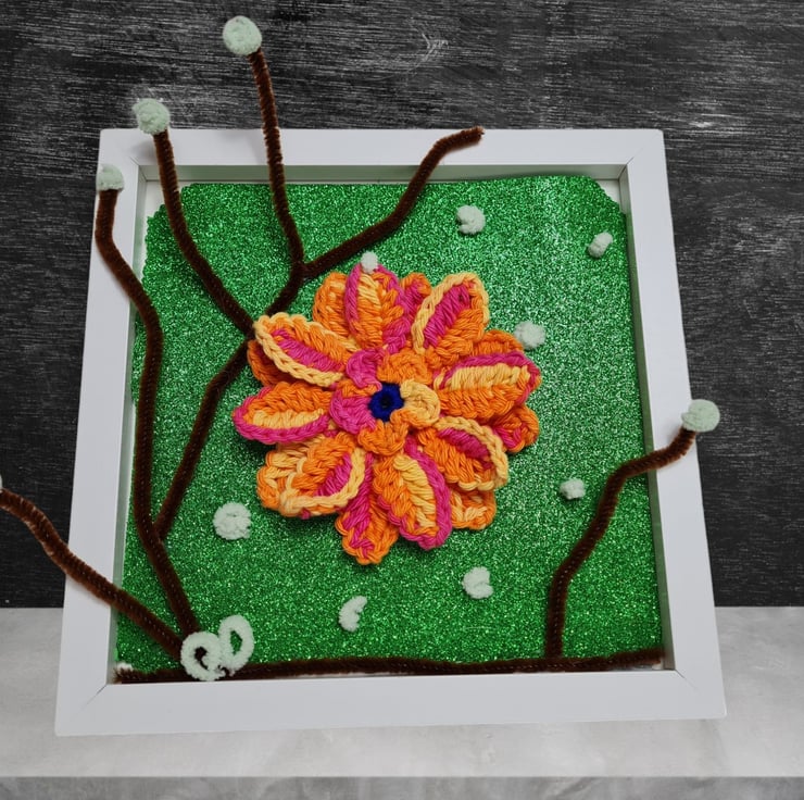 white photo frame decorated with crochet flower, brown pipe cleaner, green glittery foam sheet.