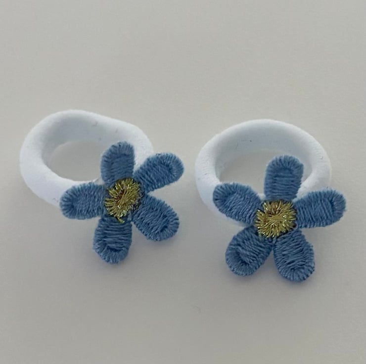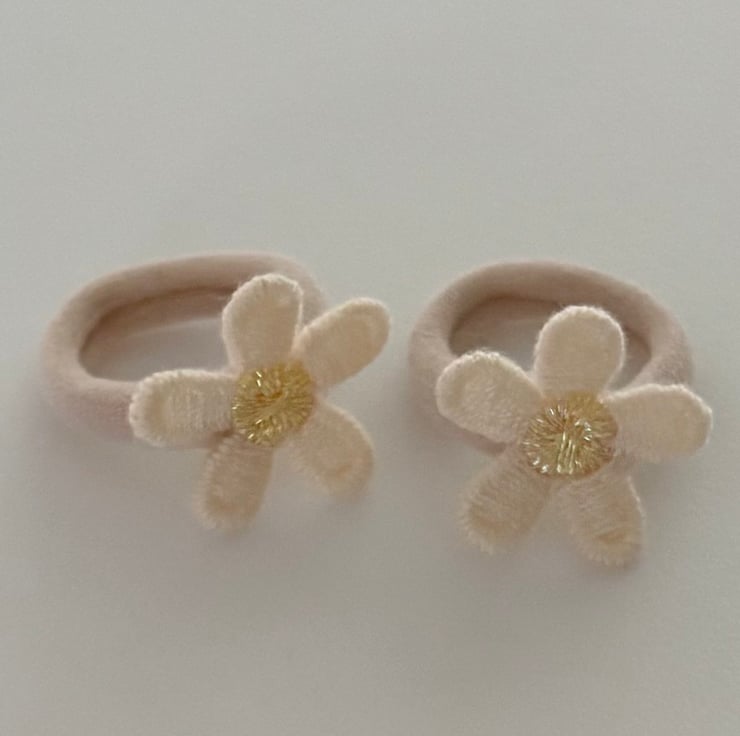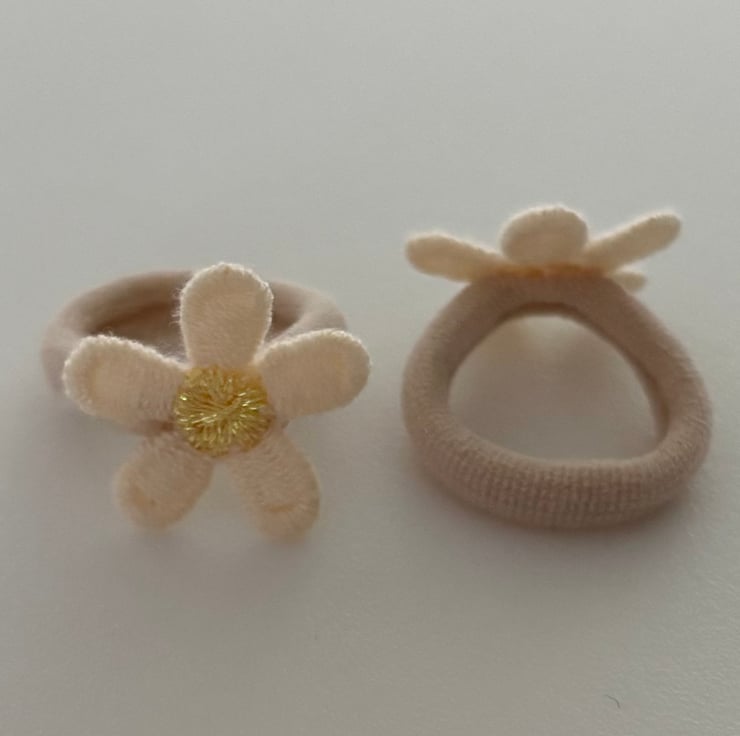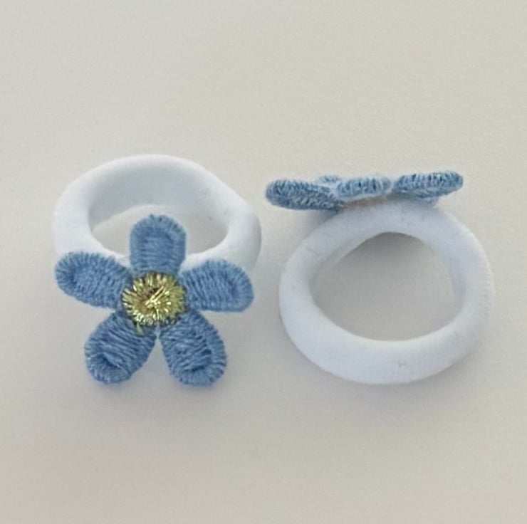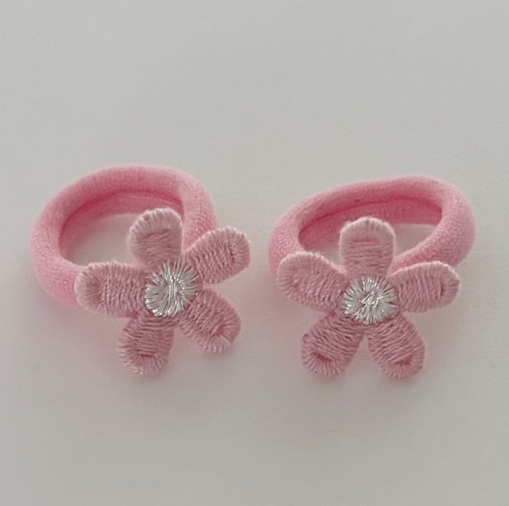 Handmade sweet mini cotton sewn flowers with sparkly middles, set on mini nylon bands for a soft comfortable hold. Perfect for babies first hair bobbles and any age.