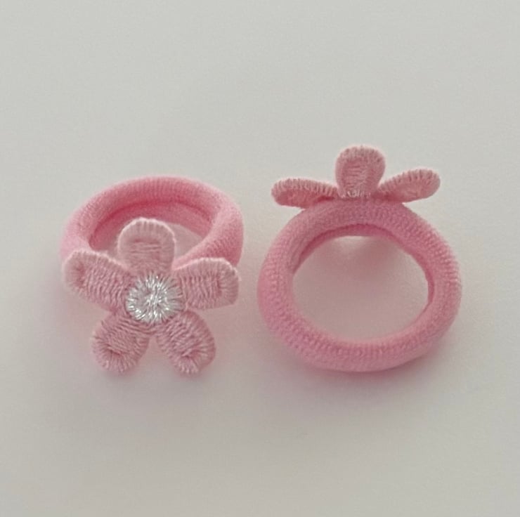 Handmade sweet Pink mini cotton sewn flowers with silver sparkly middle, set on pink mini nylon bands for a soft comfortable hold. Perfect for babies first hair bobbles or any age.