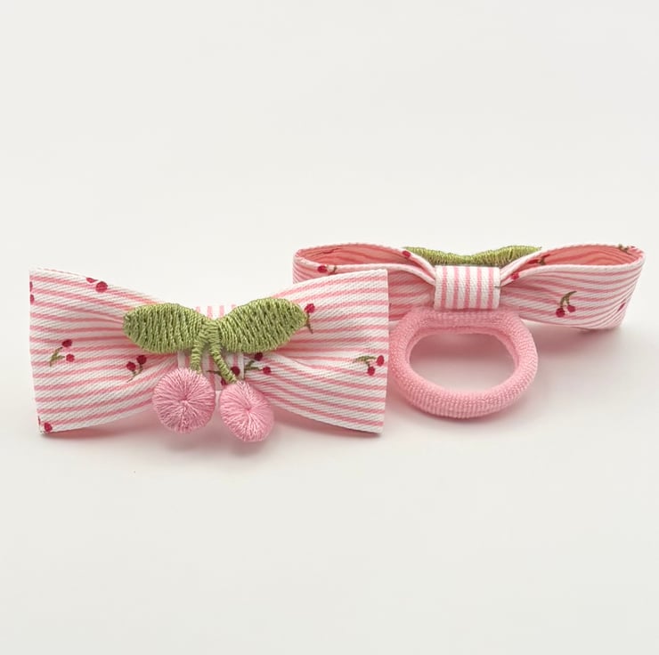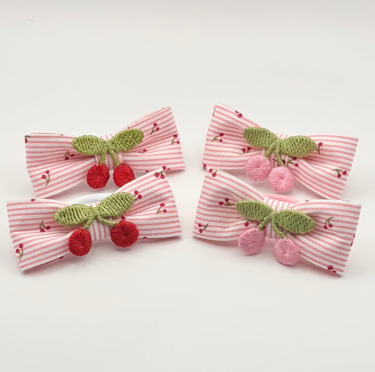 Handmade 100% high quality cotton fabric candy stripe and cherry hair bows, with embroidered pink cherry embellishments. Set on Pink mini nylon bands for a soft and comfortable hold.