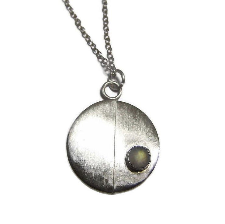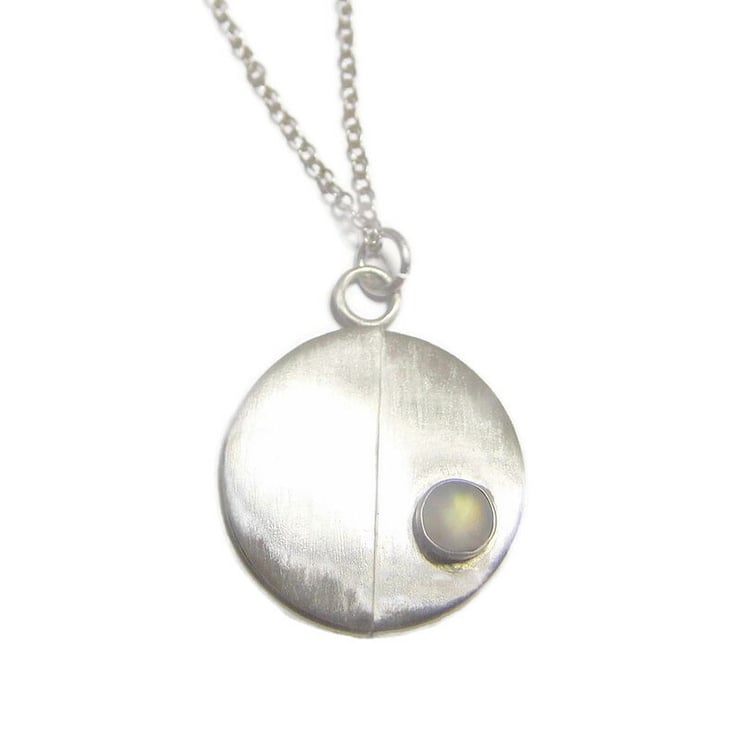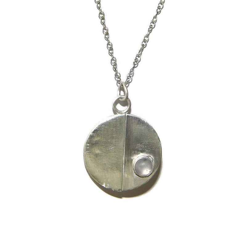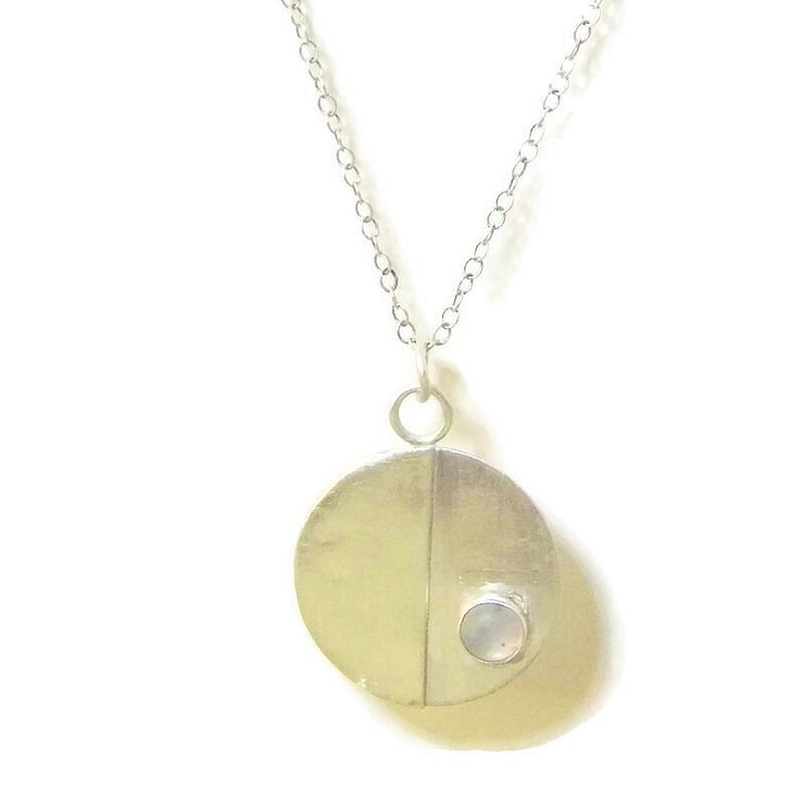 An elegant pendant handmade from recycled sterling silver sheet metal which has been cut into a disc and embellished with a half circle overlay and natural moonstone cab