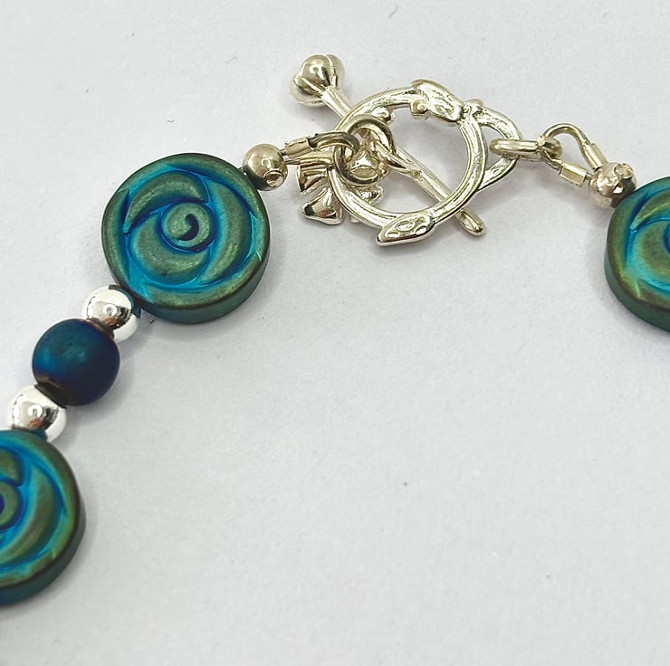 Elevate your accessory game with this stunning unique design handmade bracelet featuring a harmonious blend of blue and green hues. Crafted with genuine matte green and blue plated 12mm hematite rose discs, this piece is beautifully accented by 6mm matte blue and 4mm plated silver hematite round beads. The elegant sterling silver flower toggle clasp adds a touch of charm, making it not just a bracelet but a statement piece. Measuring 8 inches, including the clasp, it’s perfect for any wrist. Plus, it comes beautifully packaged in an organza gift pouch, making it an ideal gift for yourself or someone special. Embrace the grounding and protective properties of hematite, known as the “stone of the mind,” while looking effortlessly stylish.