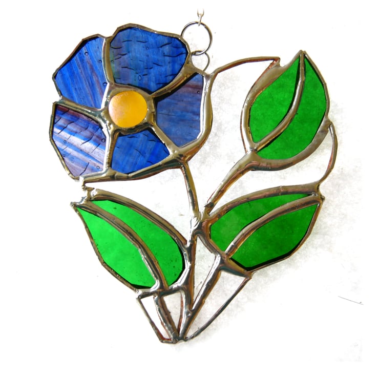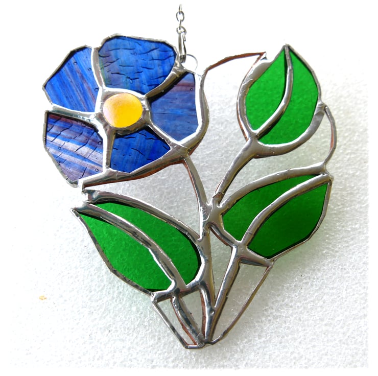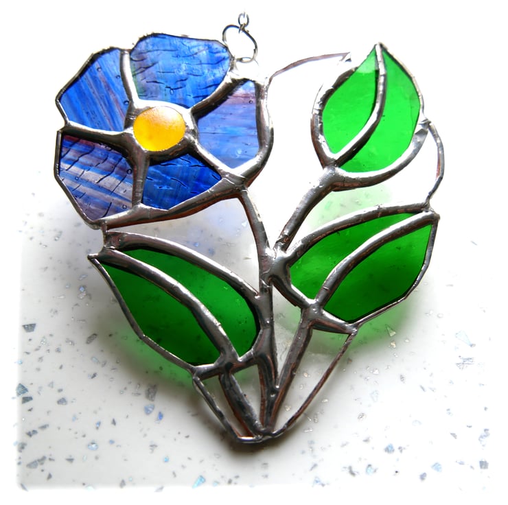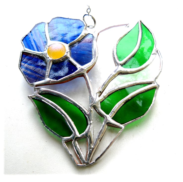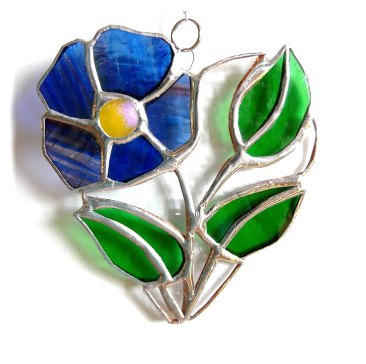 A Pansy Heart. An original design which features a pretty five-petal blue pansy with a yellow glass nugget at the centre and with green textured glass leaves.