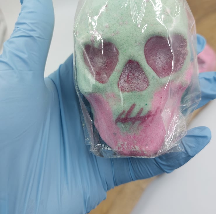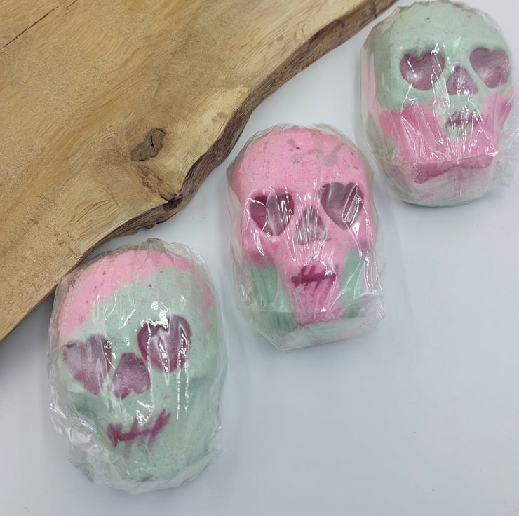 Large skull shaped bath bomb infused with sherbet orange fragrance.