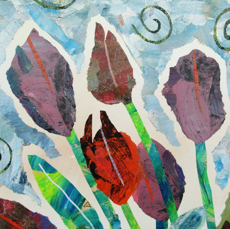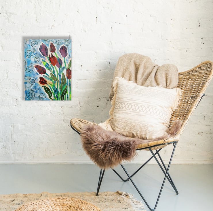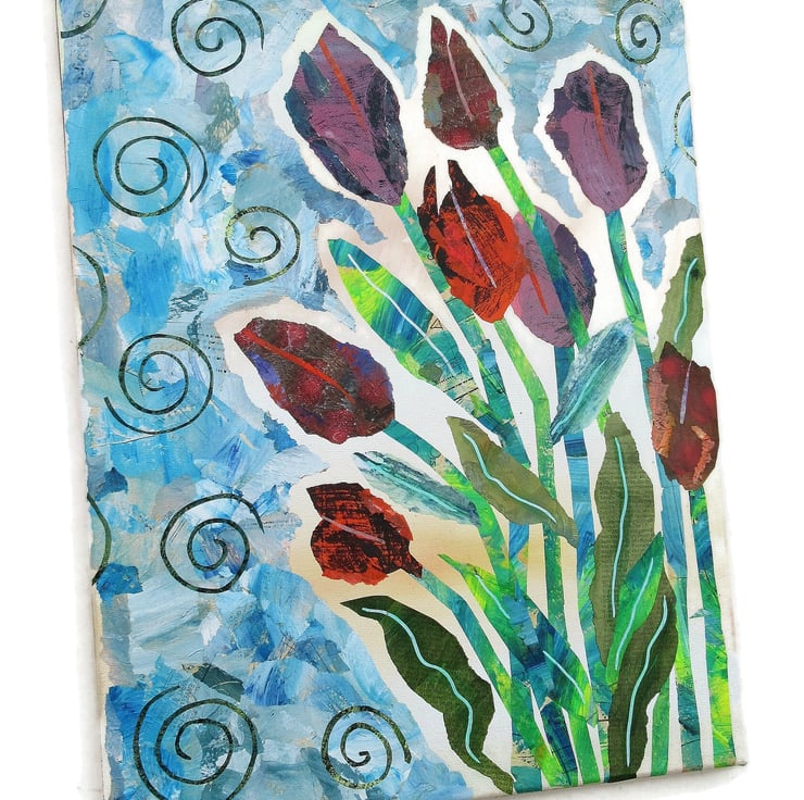 Mixed media floral / tulips painting in acrylic and collage on 14 x 18 inch stretched canvas with (gold) painted edges so no framing is necessarily required. Colourful and vibrant, the painting is signed up the edge by Beatrice and has a soft sheen surface finish.