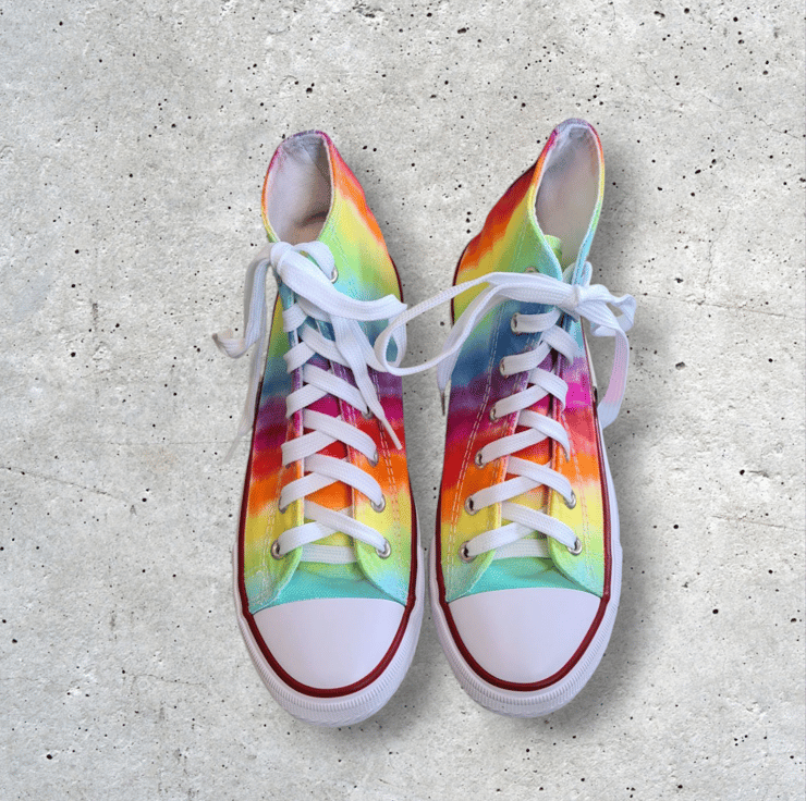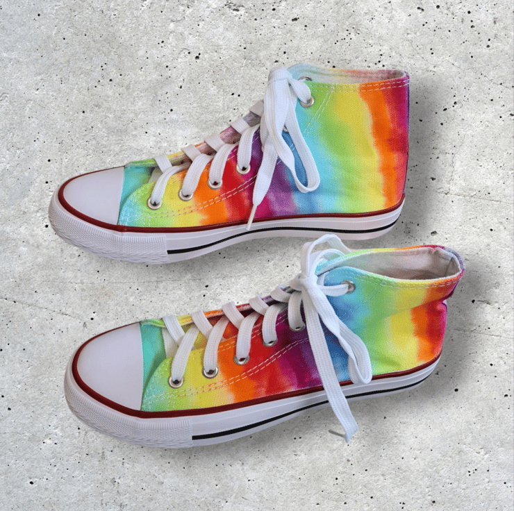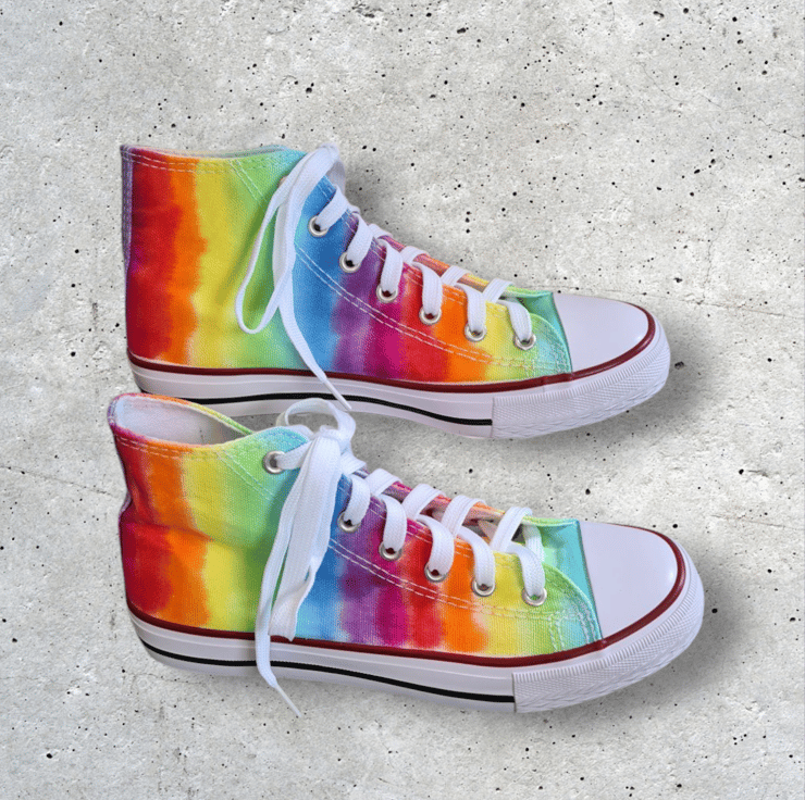 A pair of hand painted high tops in rainbow stripes, using professional dyes and treated with a waterproof spray. Size 37