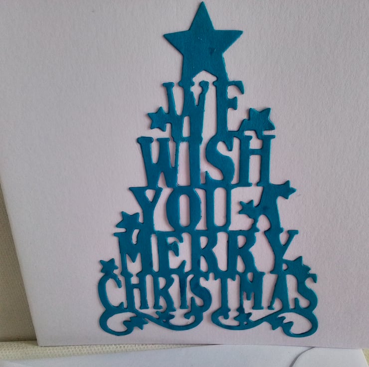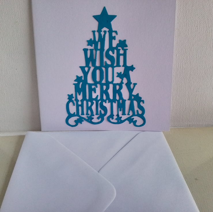 A simple Christmas card with a turquoise colour tree shaped slogan 'we wish you a merry christmas'.