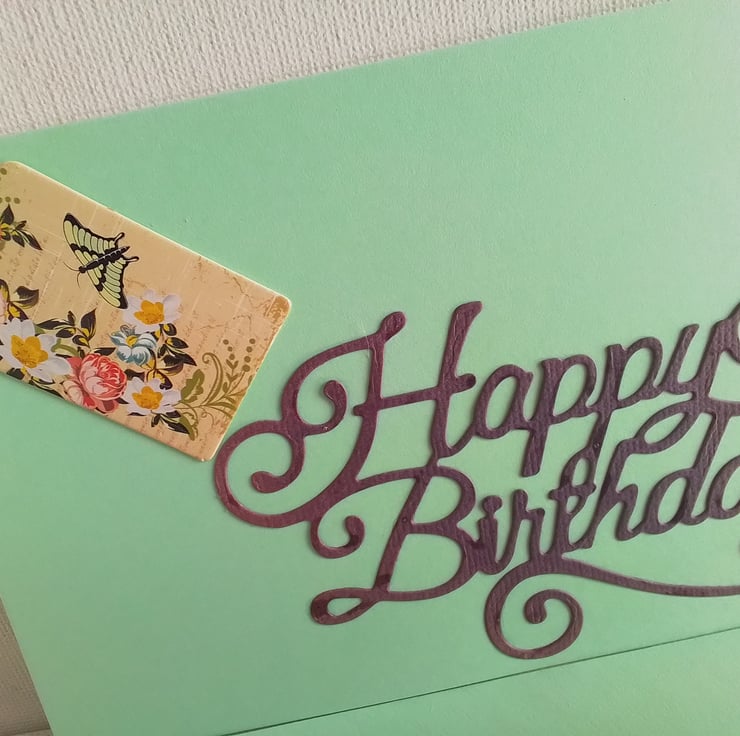 Simple in design, there is a simple gift tag with flowers and butterfly on and a 'Happy Birthday' greeting.