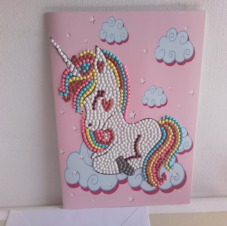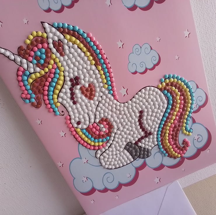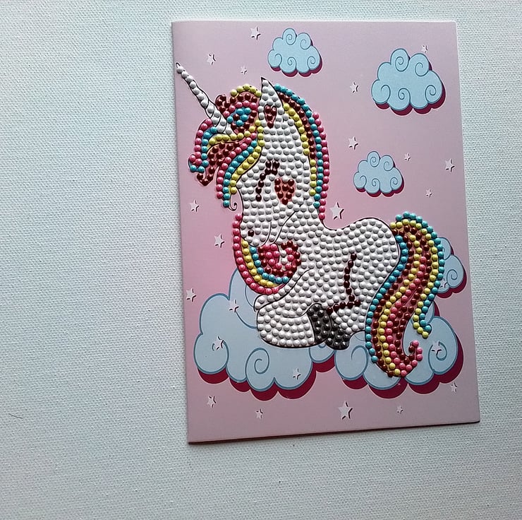 This is made using bead or diamond art and the unicorn has pale colours of the rainbow.