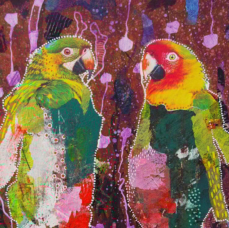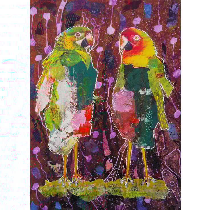 Brighten your abode with this original abstract parrot / bird painting! Vibrant colors, tropical vibes, and bold textures combine in this make this a stunning wall centerpiece. A unique hand created original in acrylic with collaged elements, hand drawn details and dynamic colors which has created a lively jungle-inspired composition which is perfect for bird lovers, tropical decor enthusiasts, or anyone who enjoys abstract and quirky expressive art. Measuring 10 x 14 inches, in acrylic, collage and artists' drawing pens on 2mm deep board, it will be hand signed on the front before shipping. It is unframed and will slip straight into any standard, off the shelf, 10 x 14" frame (or mount.) This awesome OOAK artwork will make a bold statement in any interior. Ideal for adding color, energy, and personality to your space or as a thoughtful gift for someone who loves wildlife and nature.