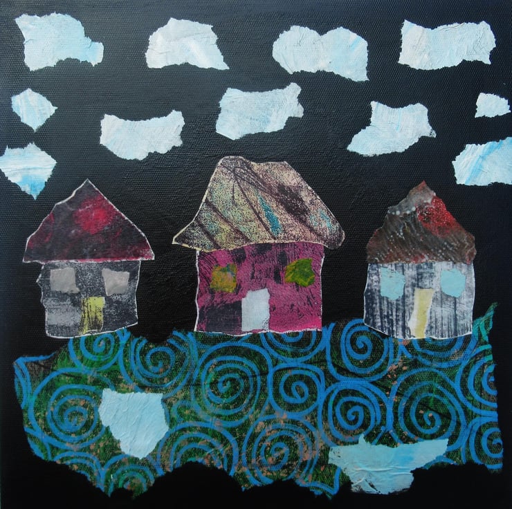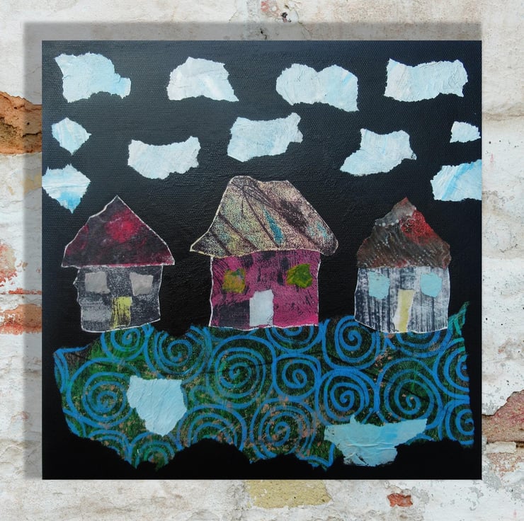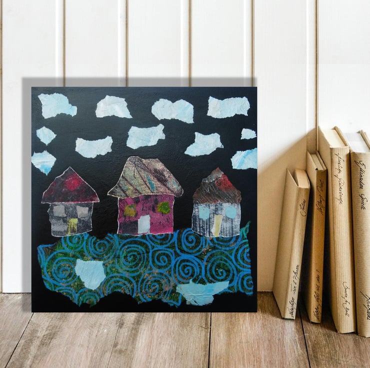 Small but beautifully formed! Mini abstract houses / cottages painting in acrylic and collage, using my own painted and printed papers, on 20 x 20 cm (7 78 x 7 78 inch) stretched 'vinyl canvas' with 1.75 cm deep edges. These cute little dwellings are so charming. The edges are painted so it does not necessarily need a frame and it is signed up the edge by Bea. With a soft sheen finish, this would be ideal for small spaces, and would make a super original art gift. Miniature art is great fun to collect and an inexpensive way to grow your original art collection.