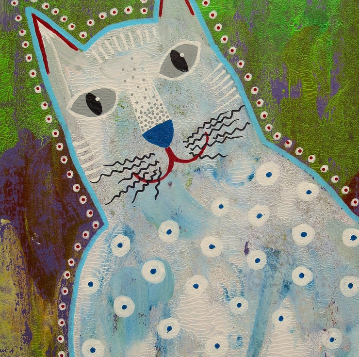 Small format cat painting measuring 5 x 7 inches, in acrylic and drawing pens on heavy tinted paper. This artwork will slip perfectly into any standard, shop bought 5 x 7" frame (or mount). Expressive and vibrant, it will be discreetly signed on the front by Bea before shipping. Artwork comes to you unframed - framed photos are for illustration purposes only.