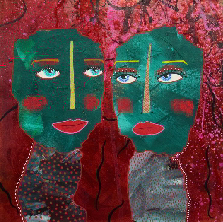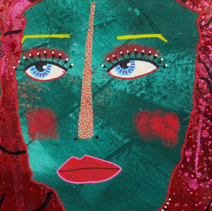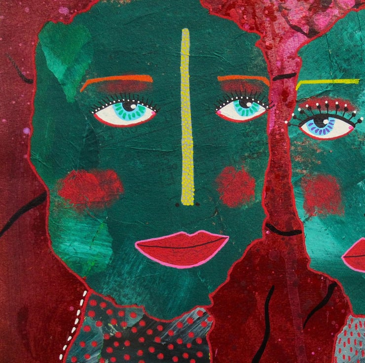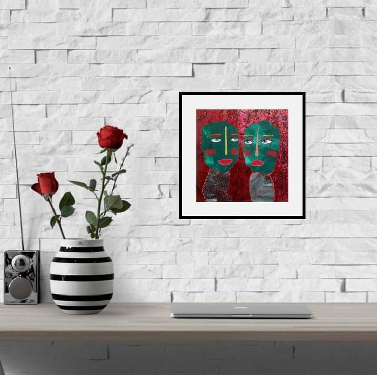 Unusual, striking, abstract portrait figures faces in collage, acrylic and drawing pens on 10 x 10 inch heavy paper. Convenient to pop straight into a standard sized 10x10" frame or mount. It will be discreetly hand signed on the front by Bea before dispatch and it comes to you unframed with a certificate of authenticity. (Framed photos are for illustration purposes only.)