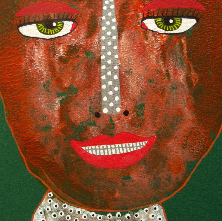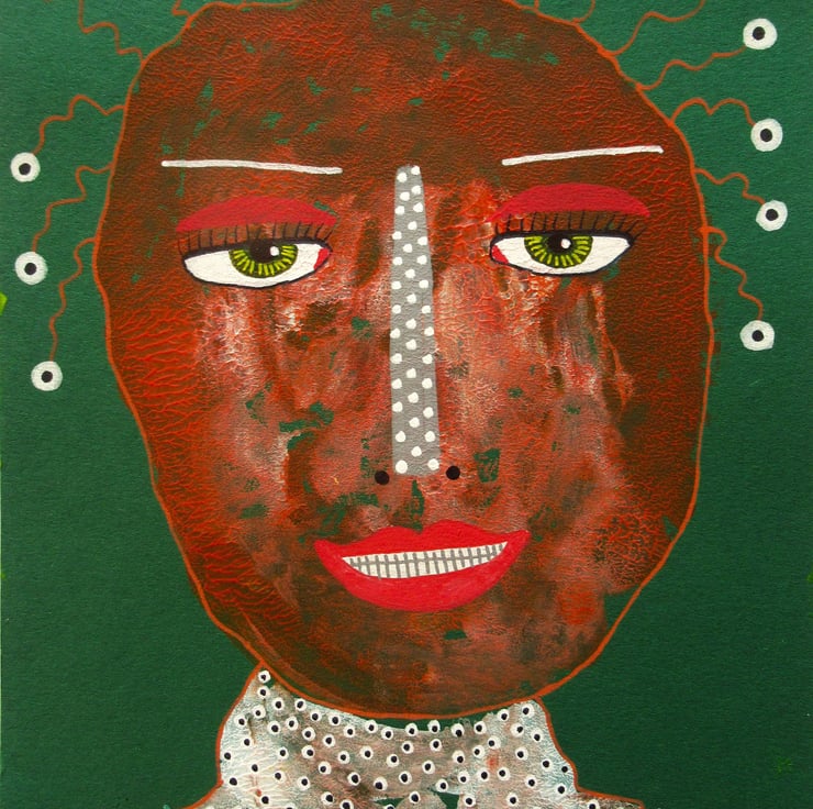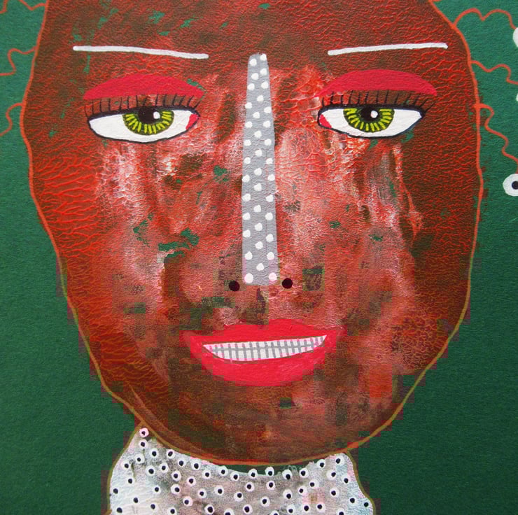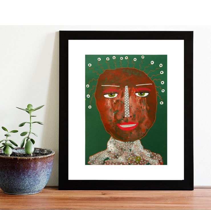 Smaller format, original portrait painting in acrylic, oil pastel and drawing pens on 6x8 inch light card. The perfect dimensions to place straight into any standard sized 6x8 inch frame (or mount.) Colourful and quirky, your artwork will be hand signed on the front by Bea before shipping. (Framed photos are illustrative purposes only.)