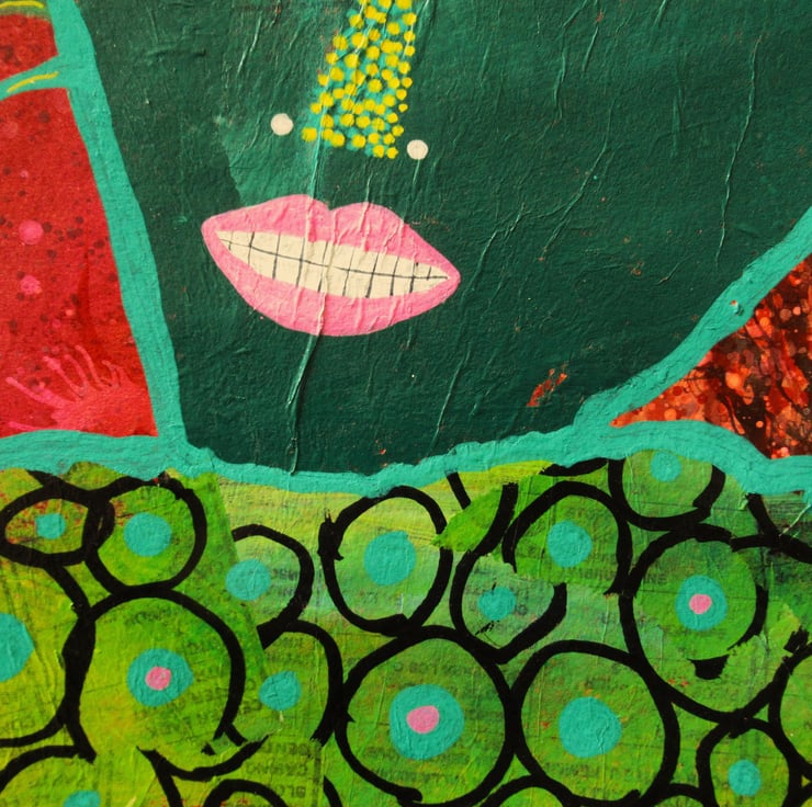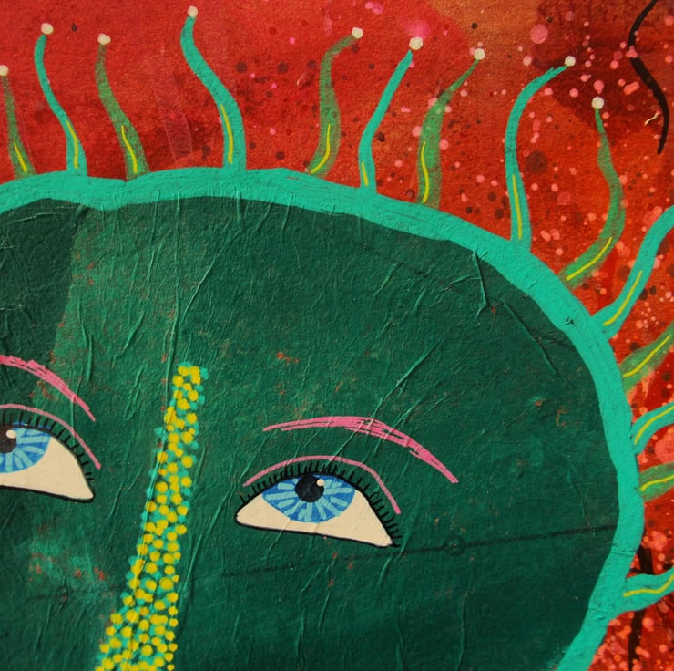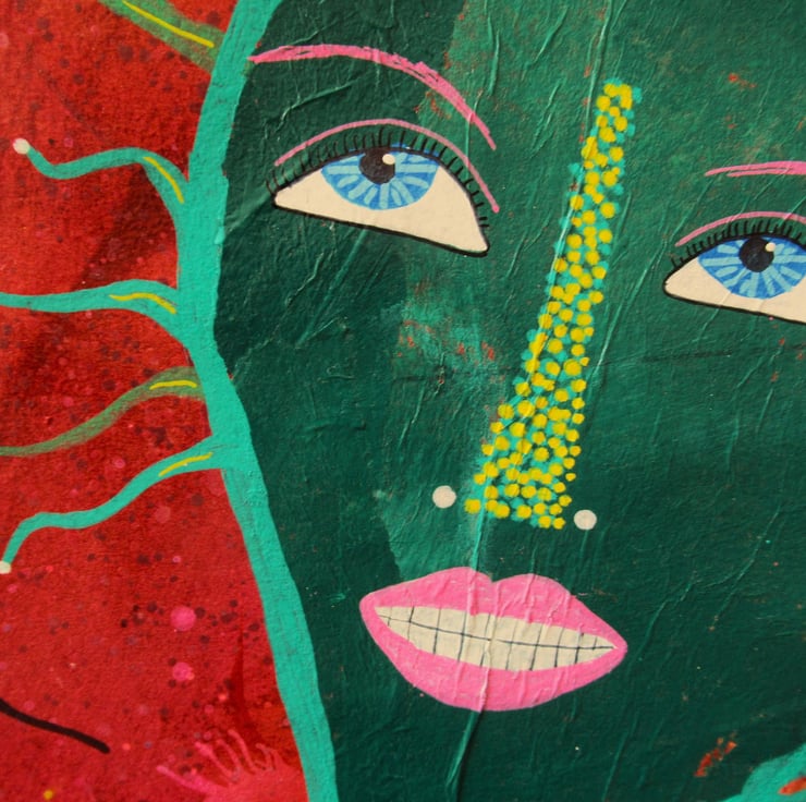 Vibrant, colourful & quirky portrait face painting in acrylic, collage and drawing pens on heavy white paper. Measuring 10 x 10 inches, so perfect to slip straight into any standard sized frame (or mount). Your artwork will be signed on the front by Bea before shipping and comes to you unframed. (Framed photos are for illustrative purposes only.)