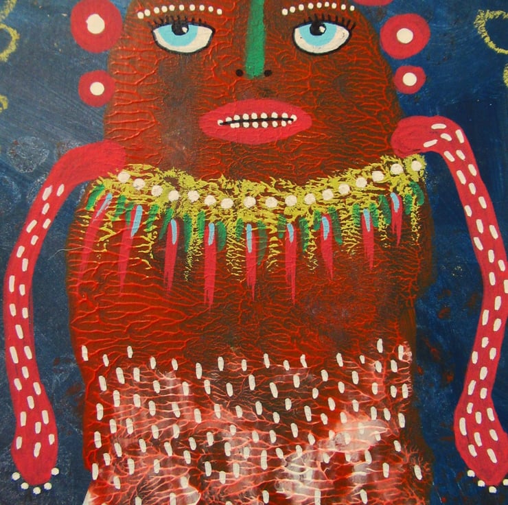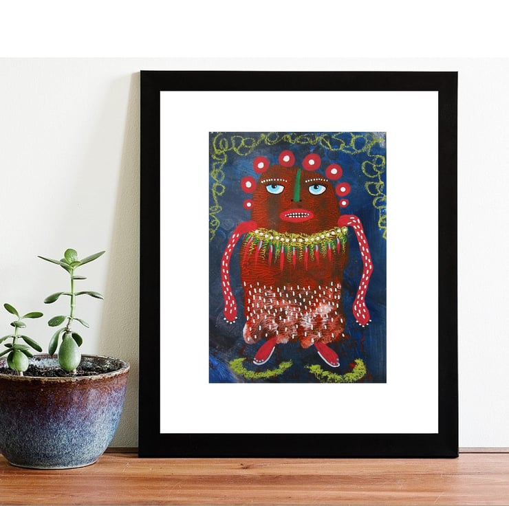 Smaller format mixed media surreal figure painting in acrylic, collage and drawing pens on 5 x 7 inch heavy paper light card. Unusual, curious, naive, primitive style artwork which is unframed but the ideal size to slip straight into any standard sized 5x7" frame or mount. It will be hand signed on the front by Bea before shipping. Small and miniature artworks are an affordable way to grow your original art collection, they are perfect for grouping on a wall, and also make brilliant arty gifts. (Framed photo is for illustration purposes only.)