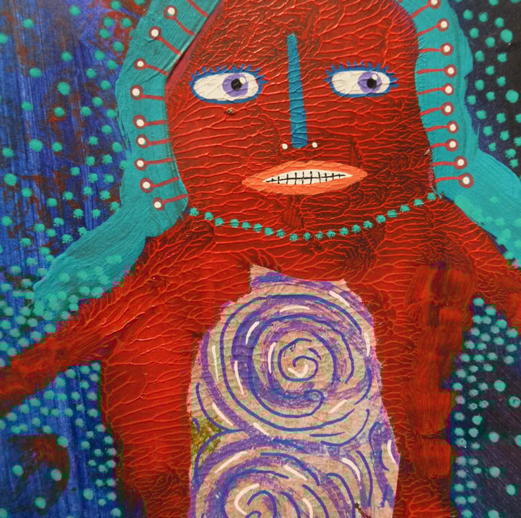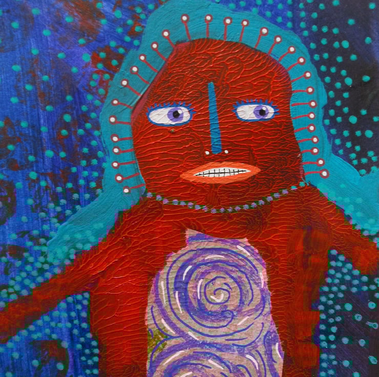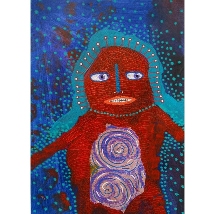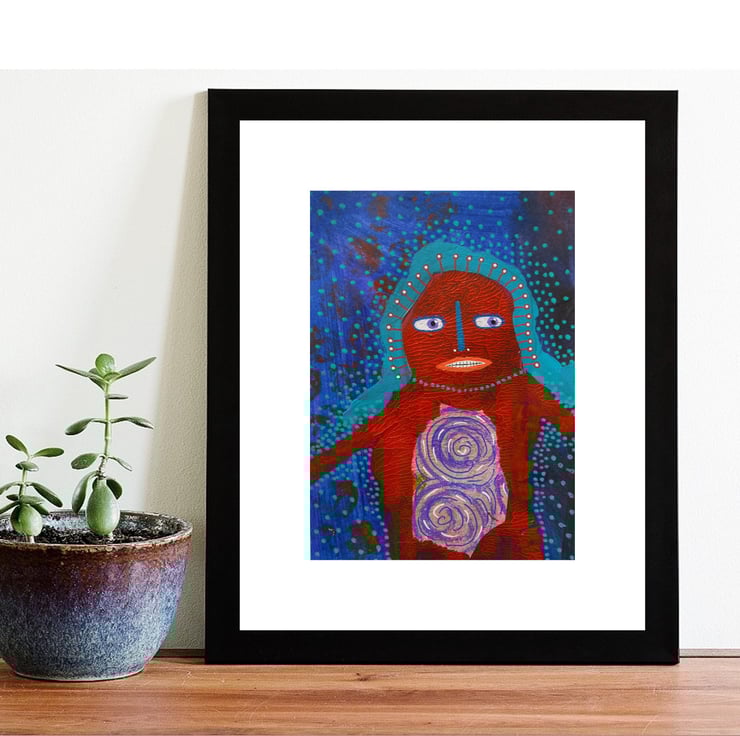 Quirky small mixed media figure painting in acrylic, collage and drawing pens on 5 x 7 inch heavy paper light card. Unusual, curious, naive style artwork which is unframed but the perfect size to place straight into any standard sized 5x7" frame or mount. It will be signed on the front by Bea before dispatch. Small and miniature artworks are an affordable way to grow your original art collection, they are perfect for grouping on a wall, and also make brilliant arty gifts. (Framed photo is for illustration purposes only.)