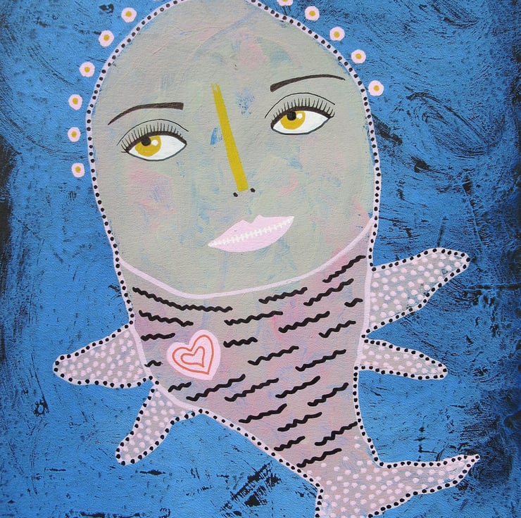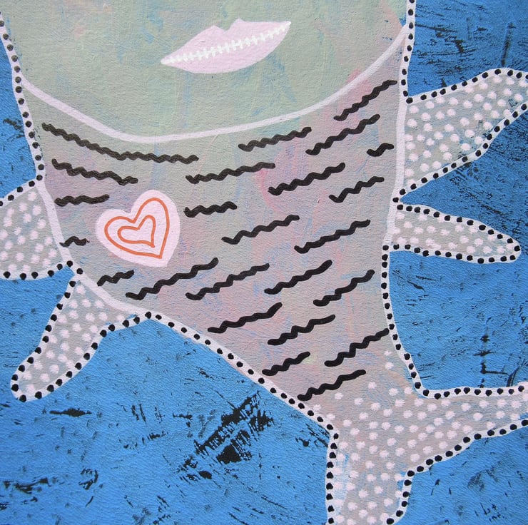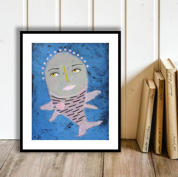 Slightly weird fish painting in acrylic and drawing pens on tinted black card, measuring 8 x 10 inches. Whimsical, cute and strange - suitable for a younger art lover or just as good in more grown up spaces. It is the perfect pop to slip straight into any standard sized 8 x 10" frame or mount and will be signed on the front by Bea before dispatch.