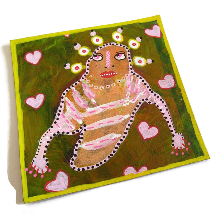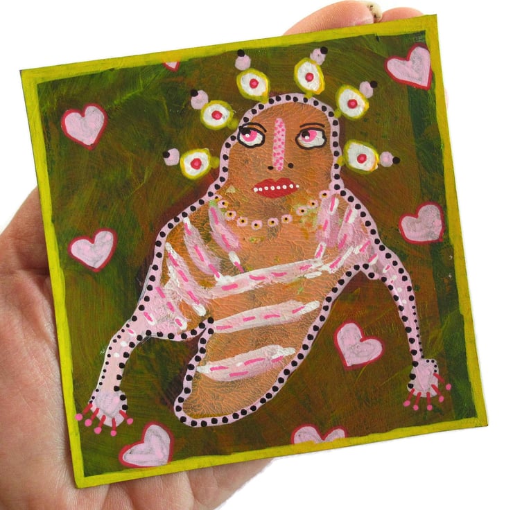 Quirky monster / figure painting in acrylic and drawing pens on black tinted light card. This quirky, small format original artwork is unframed, has a soft sheen surface finish and will be signed on the front by Bea before shipping. These mini originals are great to fill a space on a small wall or alcove, on a shelf, windowsill or mantelpiece and are perfect for grouping. They also make affordable original art gifts. Display singly, or with other miniatures in one frame for a larger artwork for the wall.