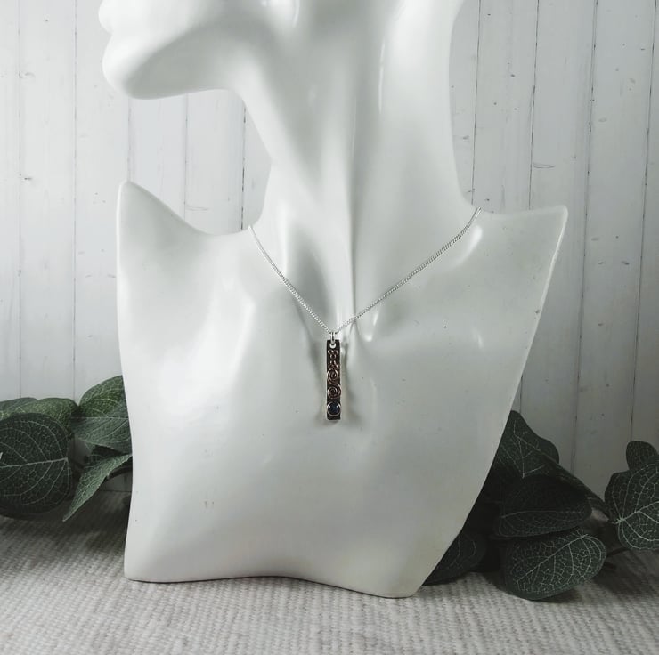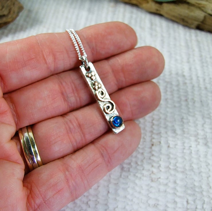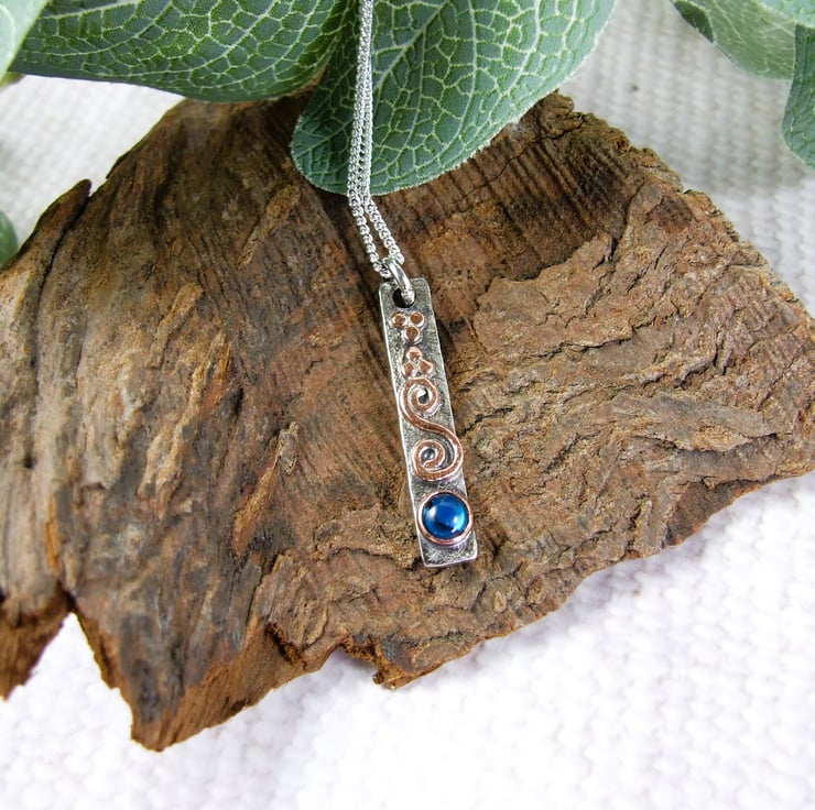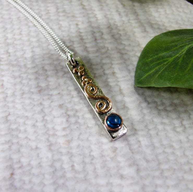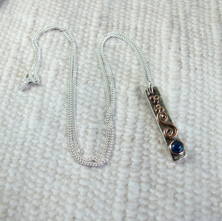 I have created the silver bar from molten silver forged and shaped into a bar in a process that takes several hours. To this I have added hand rolled scrolls from copper wire and some copper beads. Finished with a copper set paua shell in a lovely shade of blue. Fitted to an 18 inch sterling silver chain.