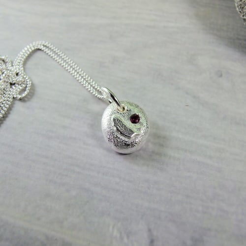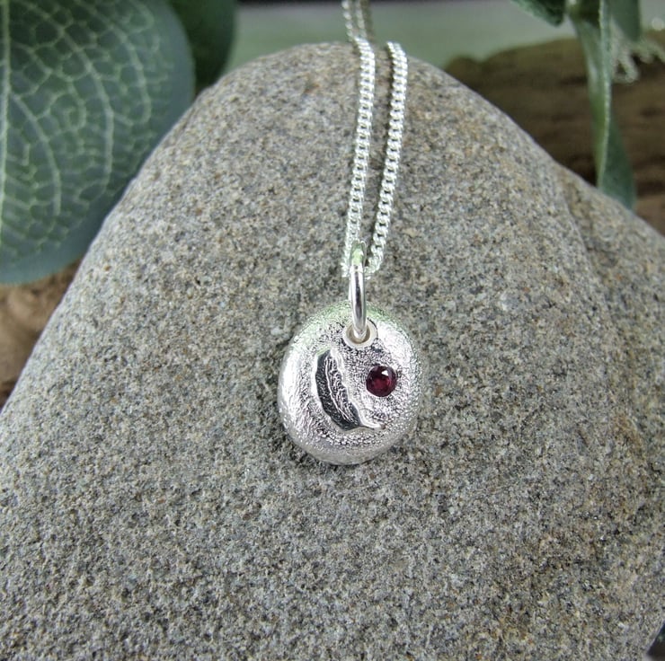 I have created the silver nugget from recycled silver heated to melting point when it forms a natural pebble shape, then once cooled slightly flattened on the top and added the loop to hang. I then soldered on a tiny feather and set the tiny 2mm faceted ruby gemstone. I created the texture on the pebble using a diamond tip hand tool and to give a sparkly finish. Fitted to an 18 inch sterling silver chain.
