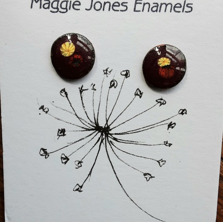 These gorgeous stud earrings are hand made from copper, kiln-fired enamel in the most beautiful shades of orange, blue and other colours.