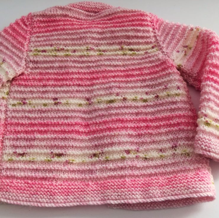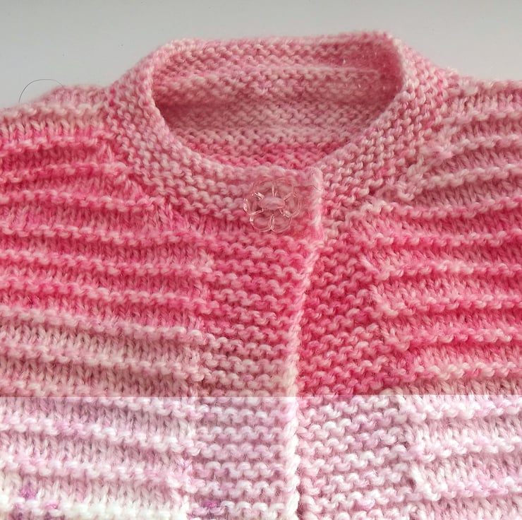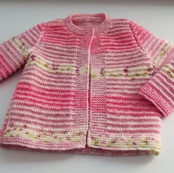 Hand knitted by me. Pink Babies Cardigan Jacket. Round neck with pattern and 1 clear flower button closure. Knitted in medium weight acrylic and wool blend yarn. hm158