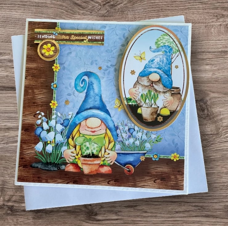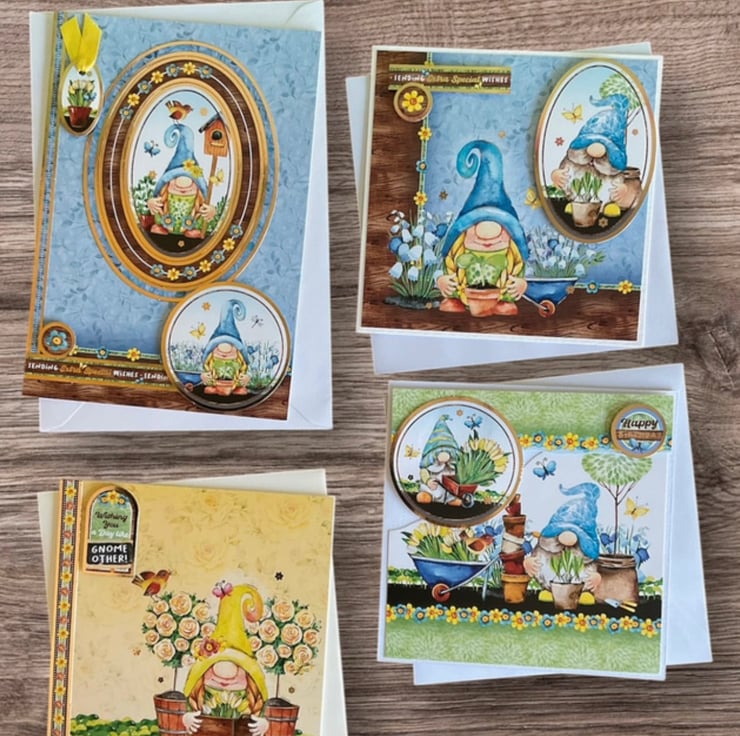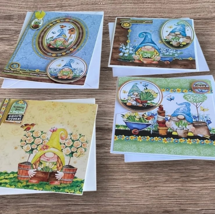 Being sold as a set of four these bright and cheerful birthday cards will make someone smile. Each card features gnomes tending their gardens. Each card has luxury gold foiled toppers with messages and lovely images.