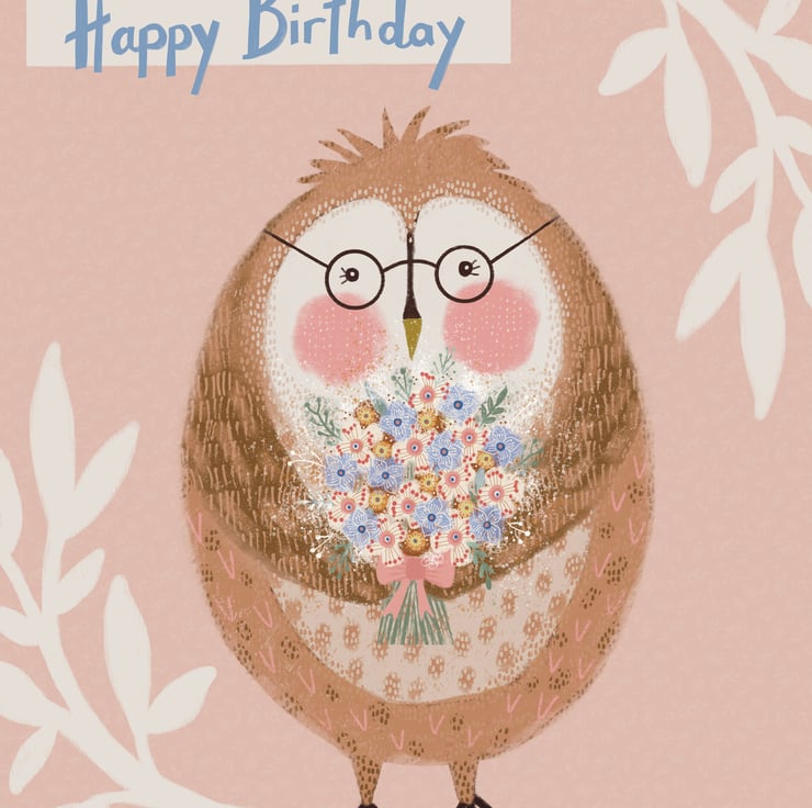 A pretty floral birthday card featuring a cute owl carrying a bouquet of flowers. This card measures 12.5x17.5cm and is blank inside. It comes with an envelope.