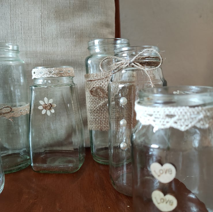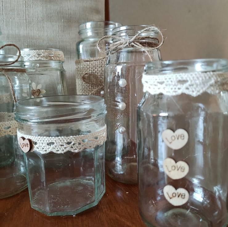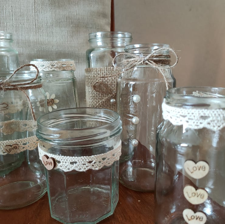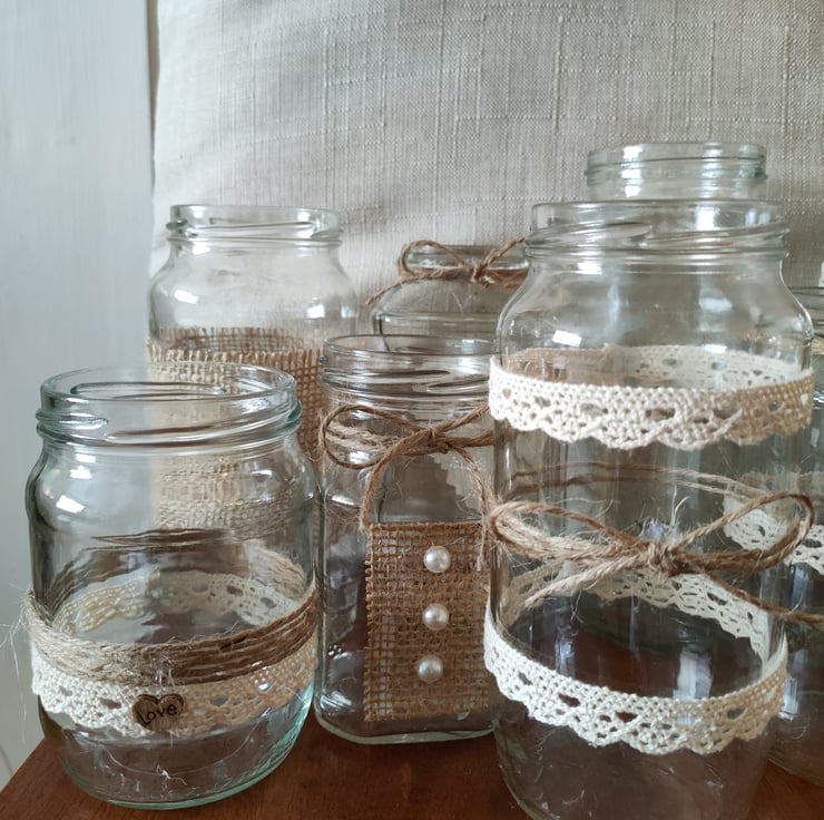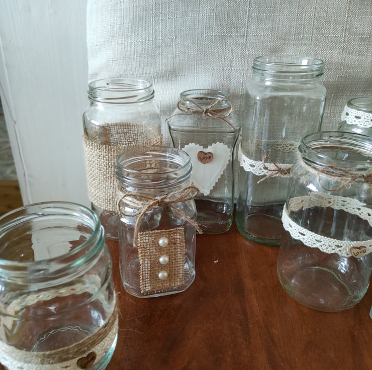 This is a set of 12 various wedding jars all hand decorated with Hessian jute and lace ideal for flowers candles lights as a clump on a table or individually..