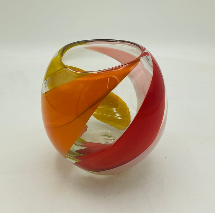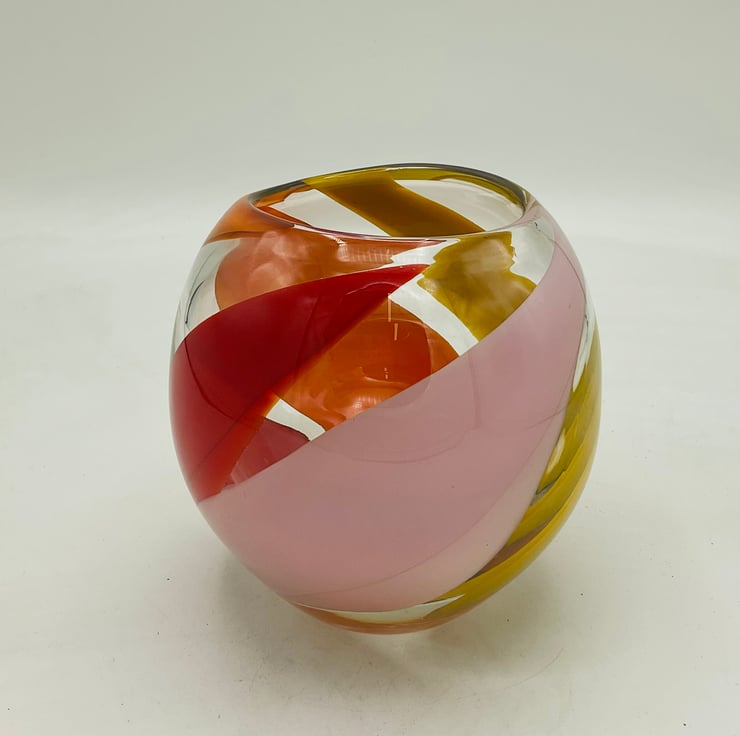 An idea has to begin somewhere. This is the beginning. All the swirls are in opaques as a contrast to the transparency of the clear. I love the organic flow of the rim as the colours distort