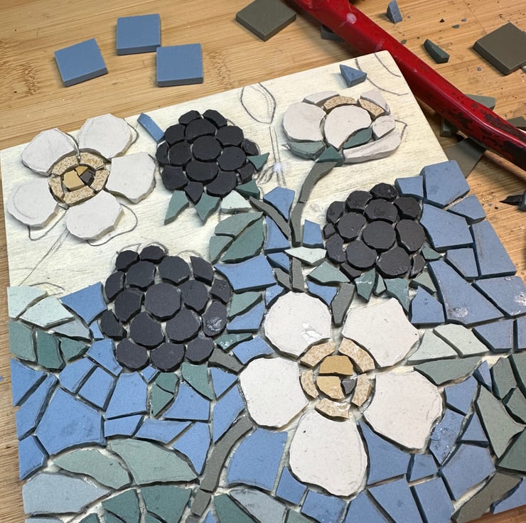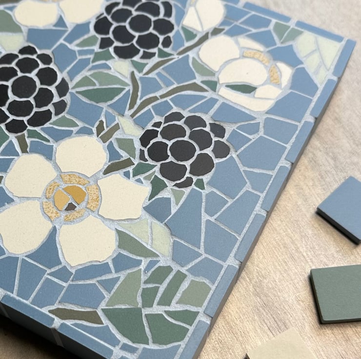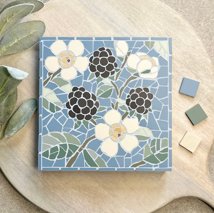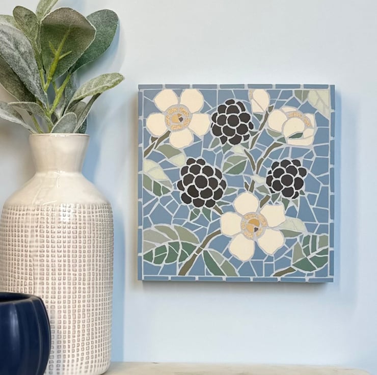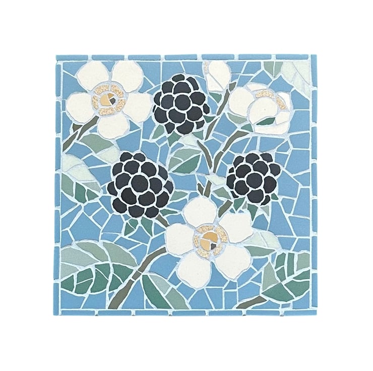 This original floral art is created in mosaic and features a blackberry bramble on a sky blue background. The leaves are created in a variety of greens and the larger than life blackberries are formed with hand cut circles of matt black tile. I also really enjoyed making the blossoms, and tried to emulate the feathery stamens by using speckled yellow.