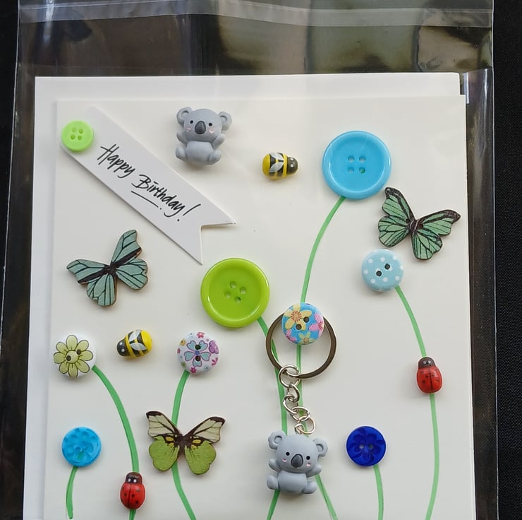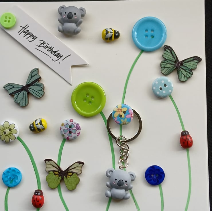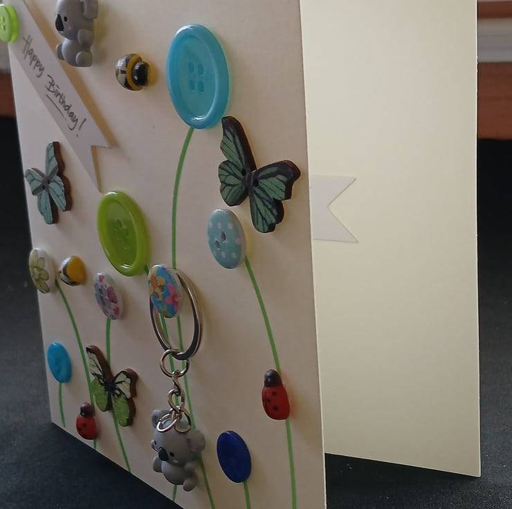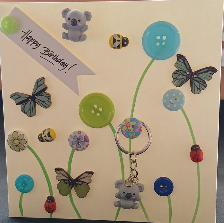 Handmade birthday card, incorporates a keyring in the design making it a card and gift all in one.