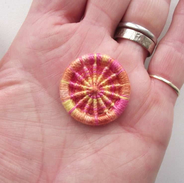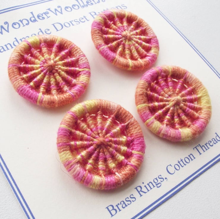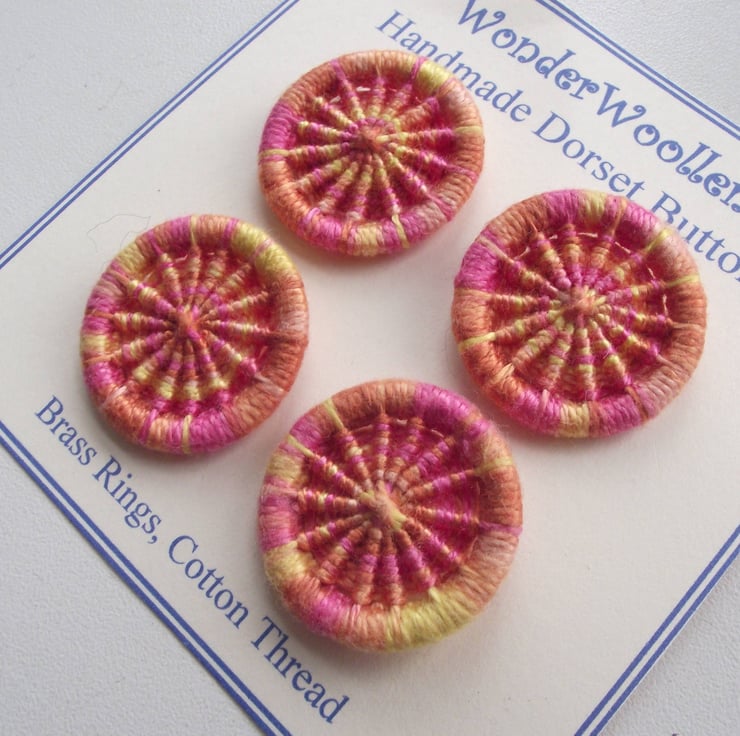 This listing is for four 2.6cm Dorset buttons. I made these by using various techniques of working cotton thread around brass rings. I have added integrated shanks for easy attachment to clothing or other item. The colours are variegated pink, orange and yellow. The thread is high quality perle cotton which has an attractive sheen.