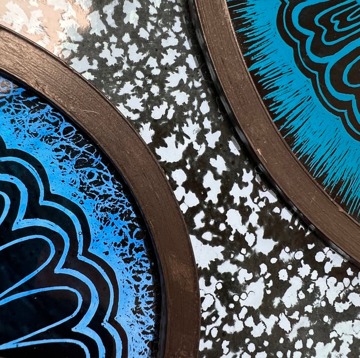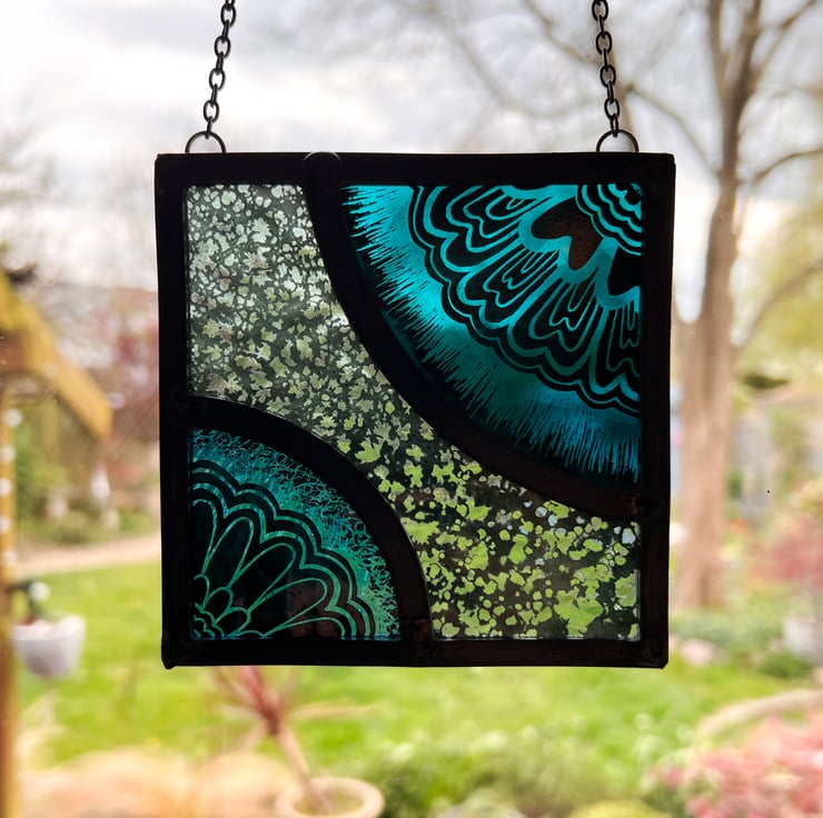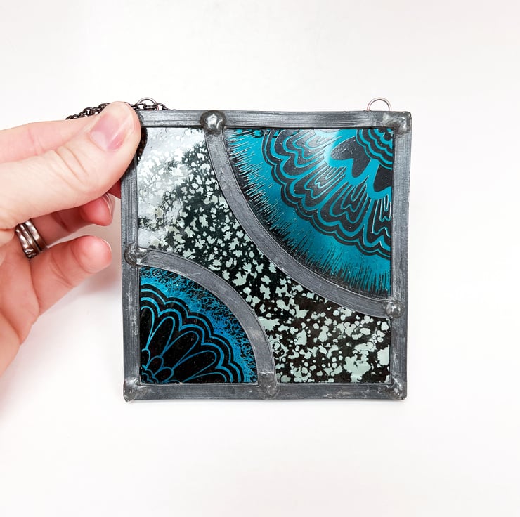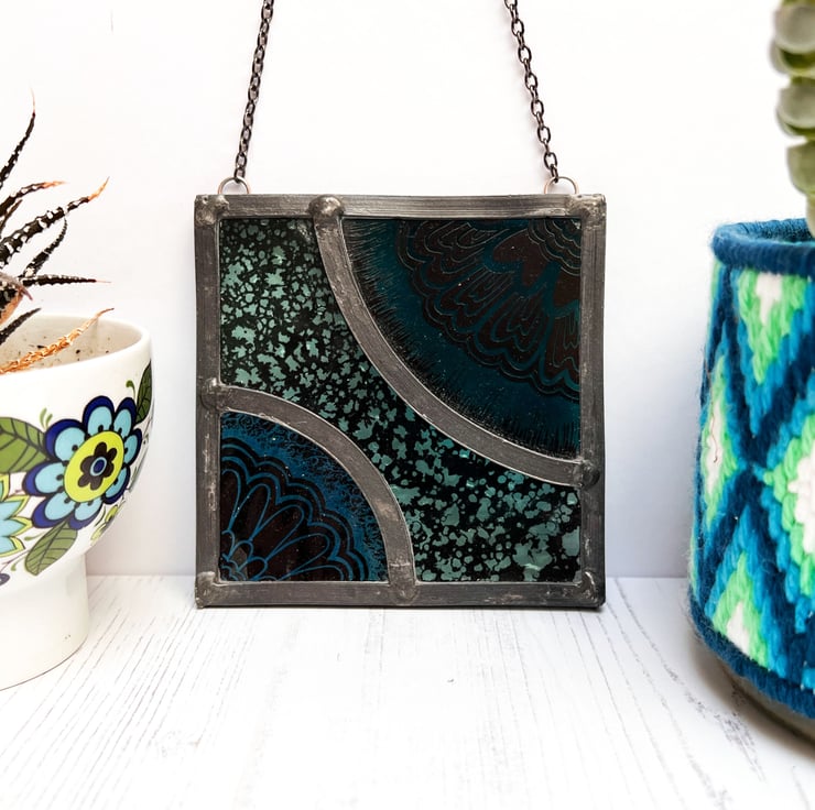 Mini traditional leaded stained glass window hanging. I've used tones of turquoise stained glass in this retro design. Made using traditional stained glass techniques, hand painted black glass paint and a sgraffito design featuring retro flowers and texture. The paint has been fired into the glass so it is permanent and won’t fade. The decoration is edged with lead came and cemented in, so it is very robust. This looks beautiful when hung in a window and is a lovely postable gift idea.