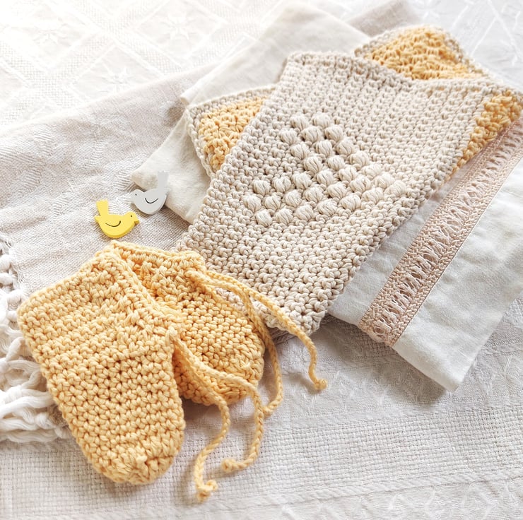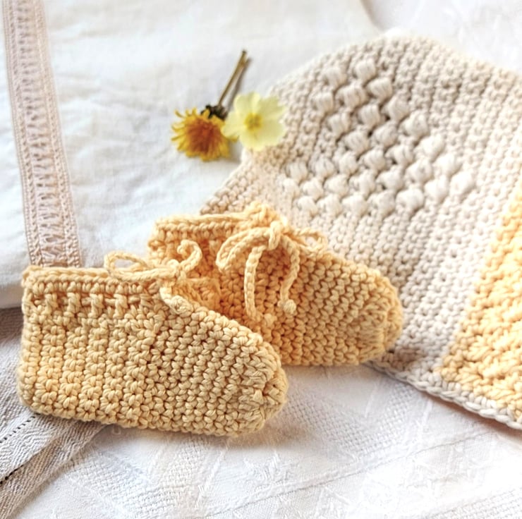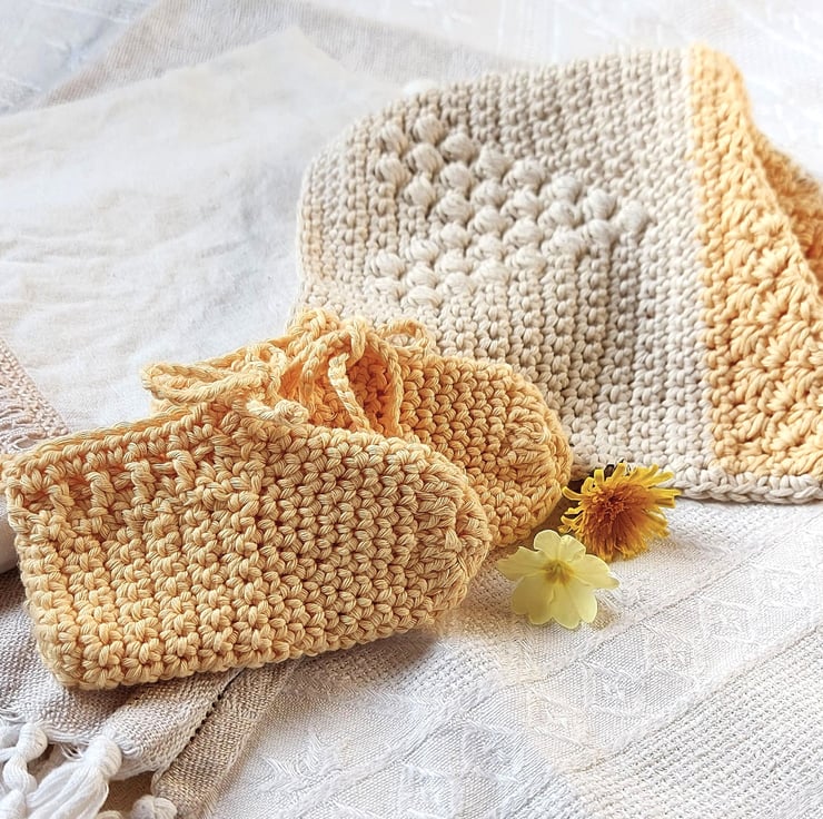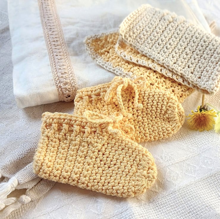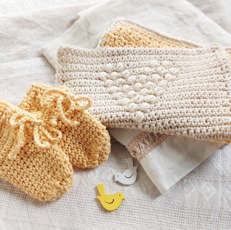 A soft, organic booties and comforter bundle, handmade with 100% organic certified cotton, gentle on delicate and sensitive skin.This cotton is highly absorbent, hypoallergenic and free from synthetic and harmful substances.