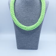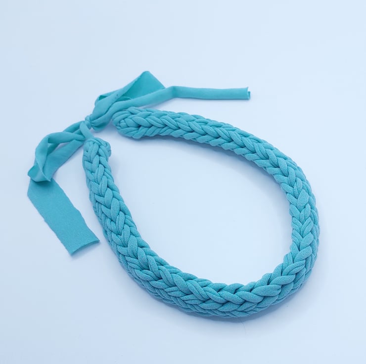Add a bold pop of colour to your outfit with this striking handmade knitted necklace in a pastel blue. Carefully crafted from soft, upcycled fabric, this lightweight accessory is both stylish and eco-friendly.