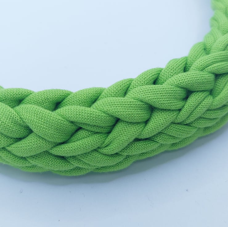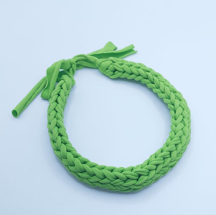 Peg loom knitted chunky bright green necklace, made using t-shirt yarn. Fastened by tying a bow at the back, allowing the length to be adjustable. This piece can also be worn as a headband.