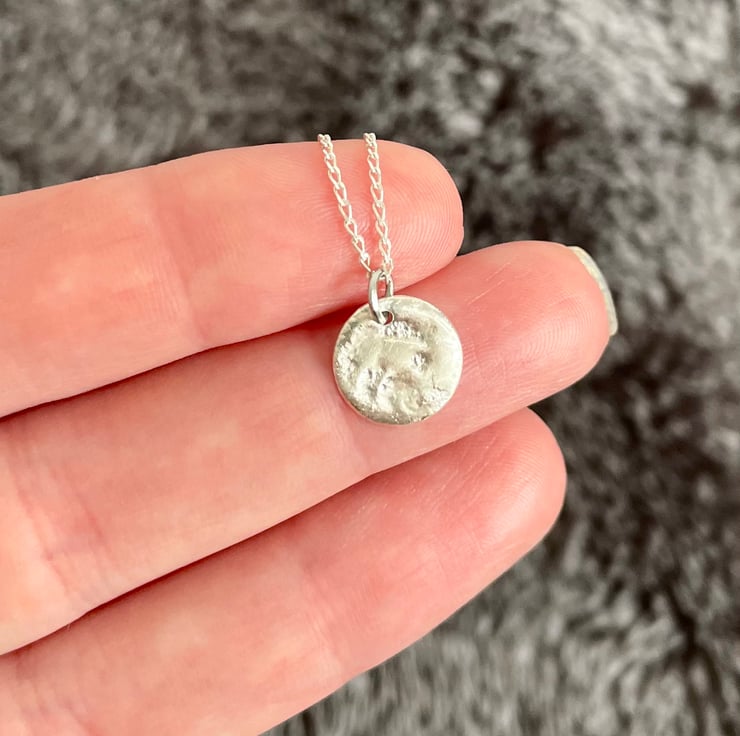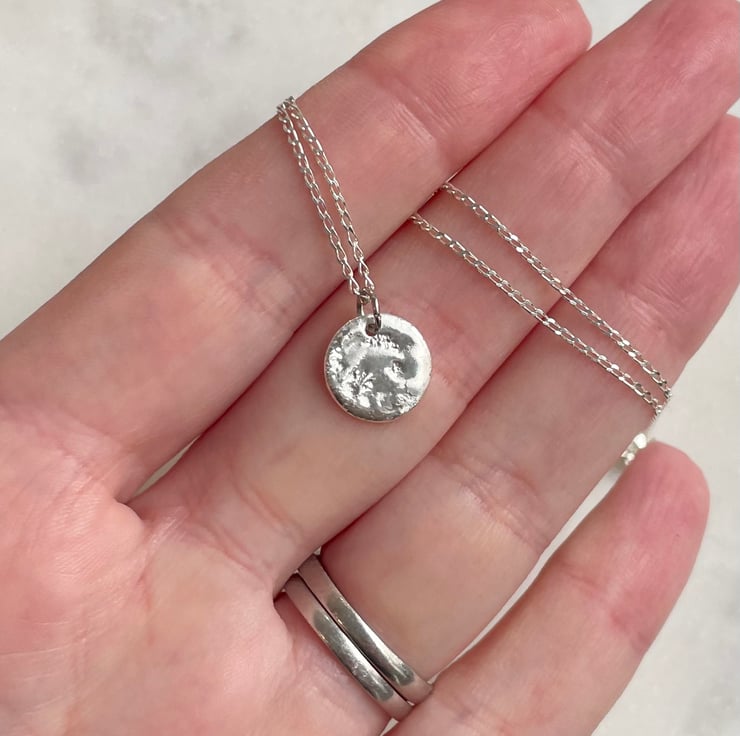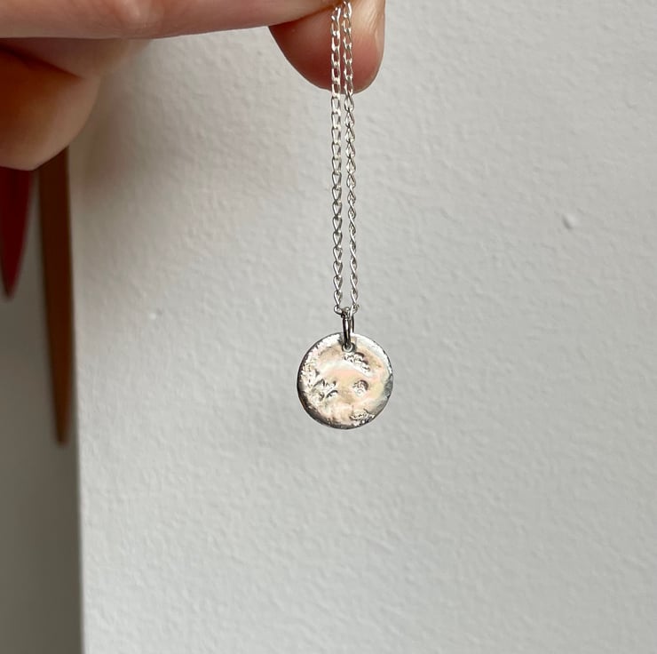 Handmade disc pendant with super shiny, textured finish – a one-of-a-kind piece. Made from 999 (99% pure) silver on a delicate sterling silver 18” chain. This necklace is packaged in a small jewellery bag, with a polishing cloth to keep it shining.