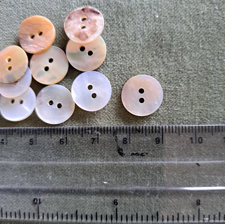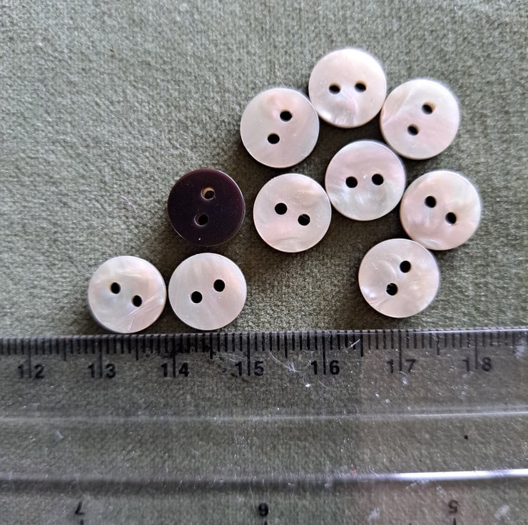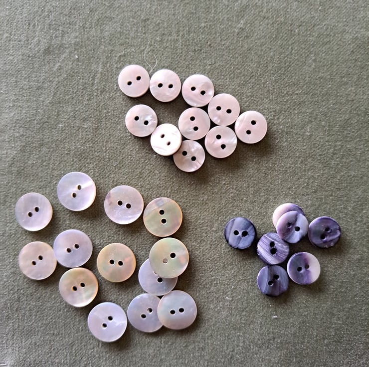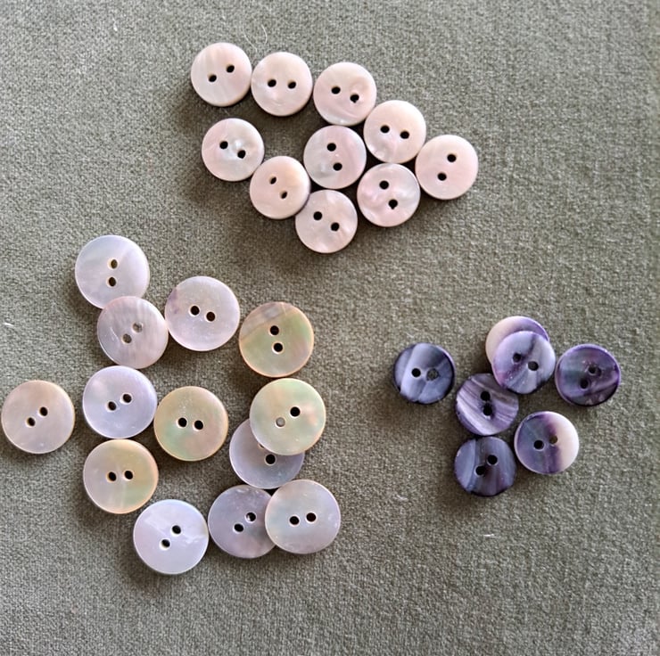 Three lots of shell shirt buttons, with all the variations and iridescence you'd expect from this natural substance. Thirteen 1.2cm pearly cream coloured beauties, seven 1cm charcoal-coloured ones and ten 1cm ones which might be imitation shell - hard to tell for sure - and with black bases.