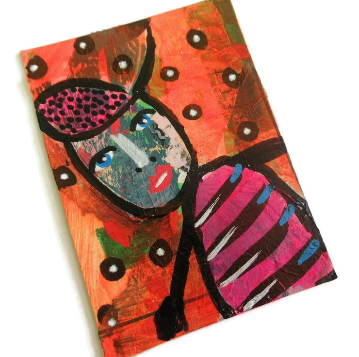Quirky, colourful ACEO miniature artwork, in acrylic, collage and drawing pens, on light card. Measuring the usual 2.5 x 3.5 inches, this cool miniature artwork would make the perfect gift for an art loving friend or loved one (or yourself!) Display in a wee frame or on a mini easel for a colourful accent, or together with some other ACEOs to make a larger piece for the wall. I will discreetly hand sign the ACEO on the front before shipping.
